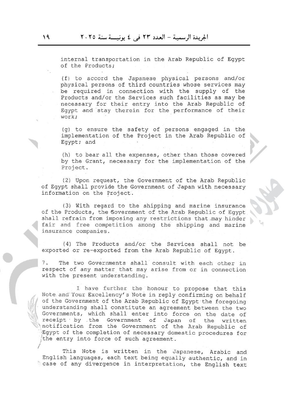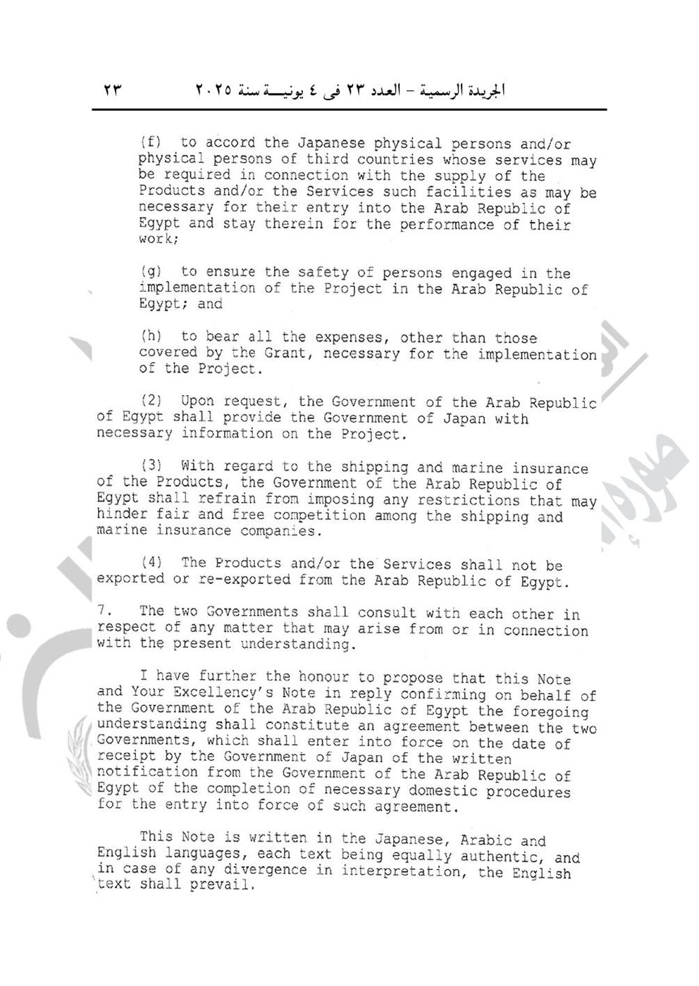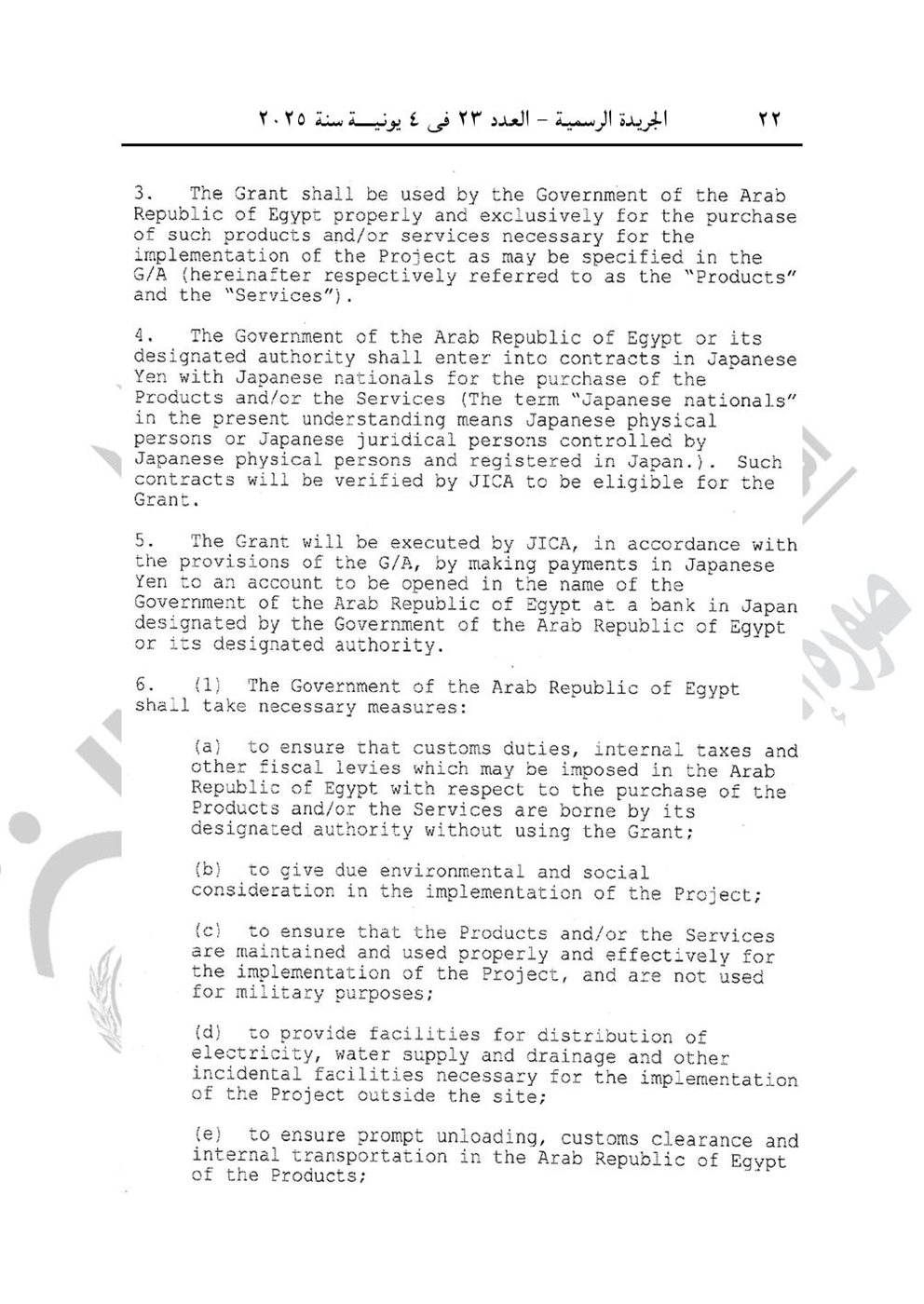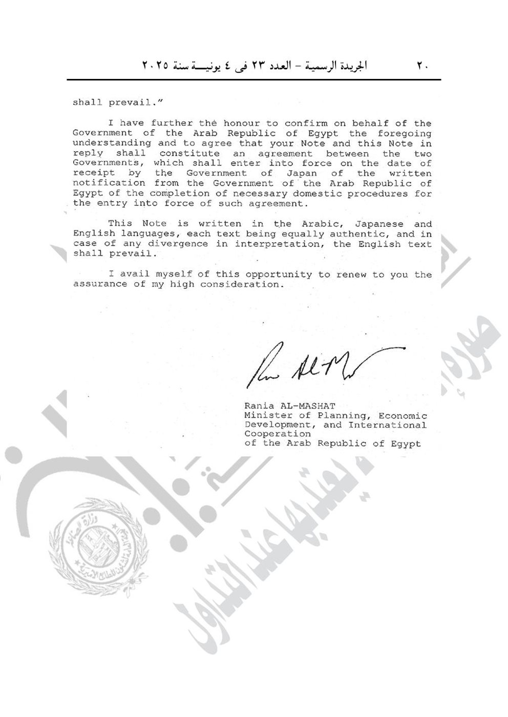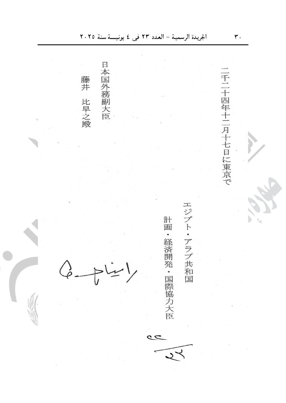 - قرار رئيس الجمهورية رقم 33 لسنة 2025، بشأن الموافقة على "الخطابات المتبادلة الخاصة بمنحة مشروع تحسين المعدات للمركز الثقافى القومى (دار الأوبرا)" بين حكومة جمهورية مصر العربية وحكومة اليابان بقيمة (180) مليون ين يابانى، وذلك مع التحفظ بشرط التصديق.