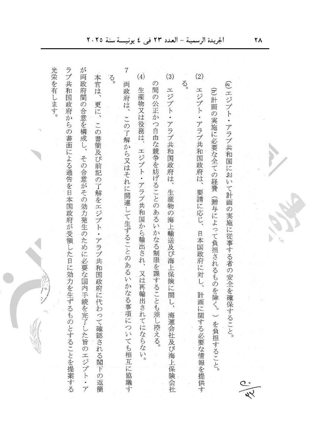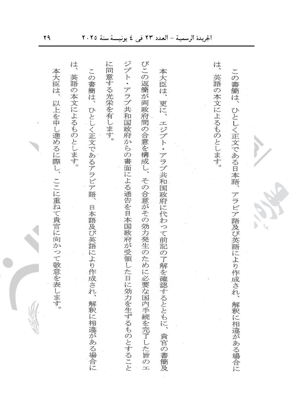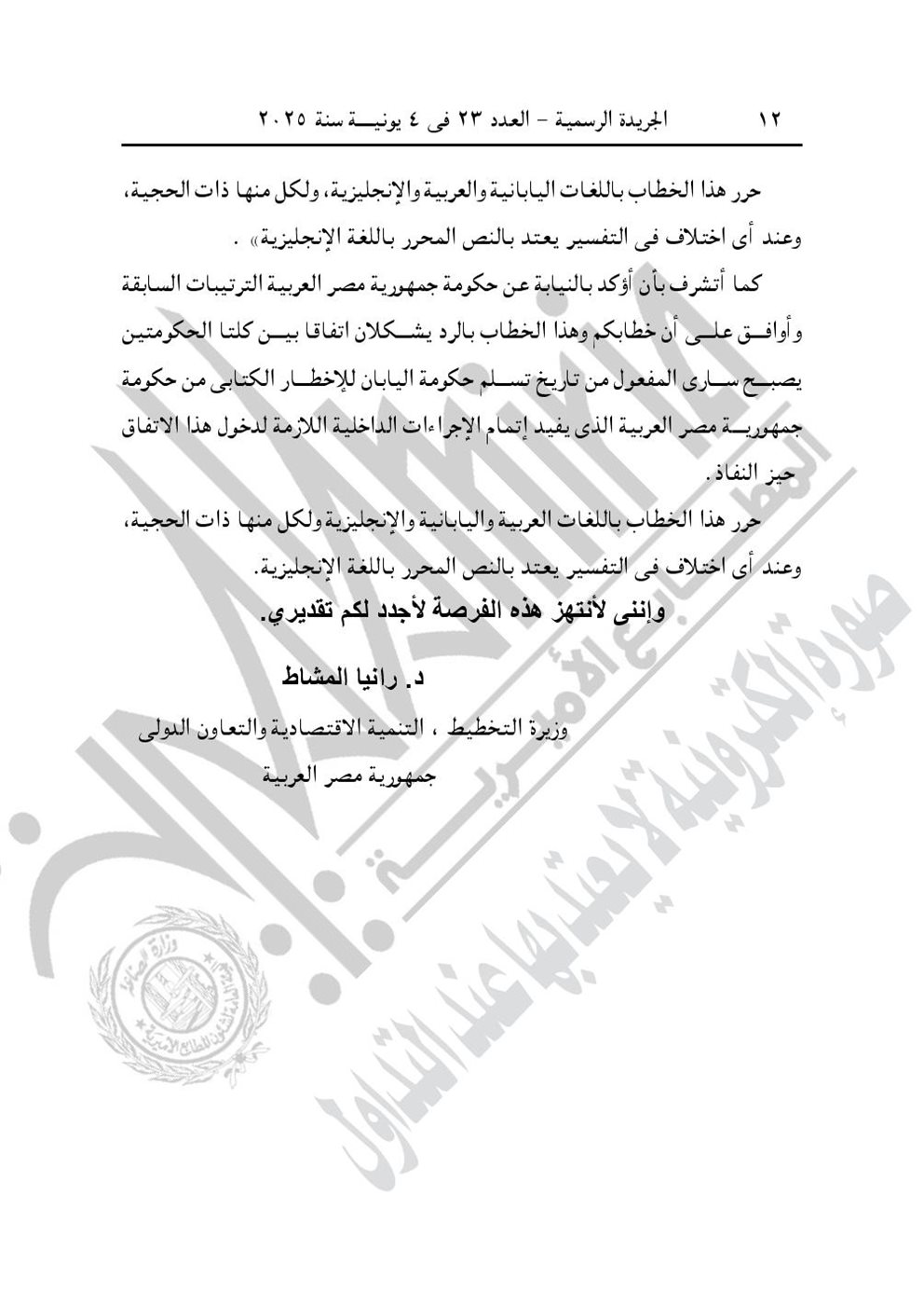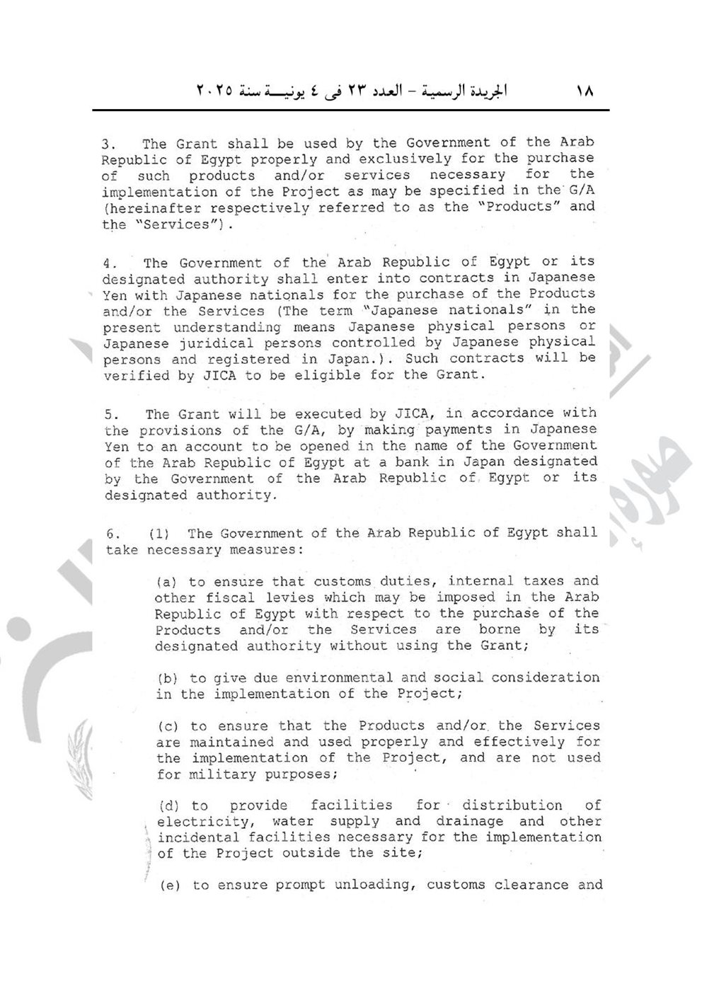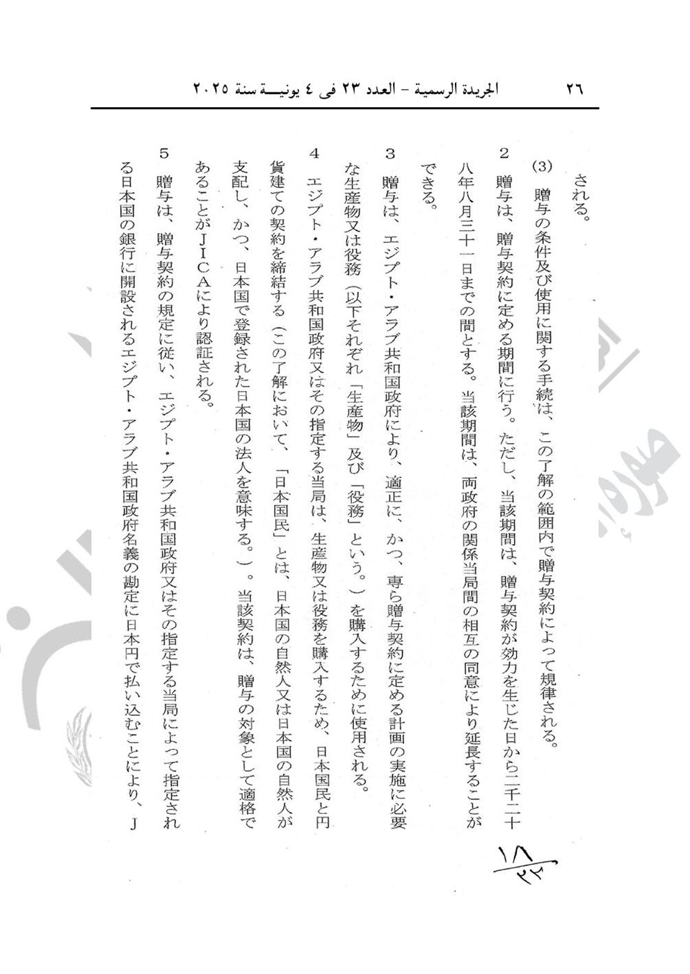 - قرار رئيس الجمهورية رقم 33 لسنة 2025، بشأن الموافقة على "الخطابات المتبادلة الخاصة بمنحة مشروع تحسين المعدات للمركز الثقافى القومى (دار الأوبرا)" بين حكومة جمهورية مصر العربية وحكومة اليابان بقيمة (180) مليون ين يابانى، وذلك مع التحفظ بشرط التصديق.