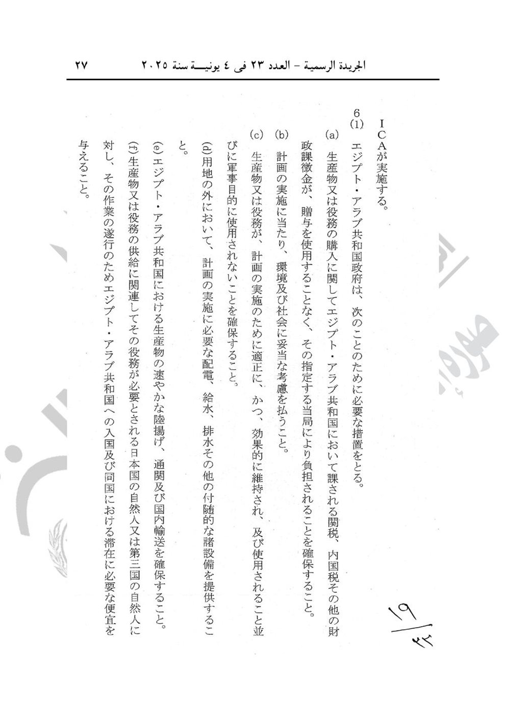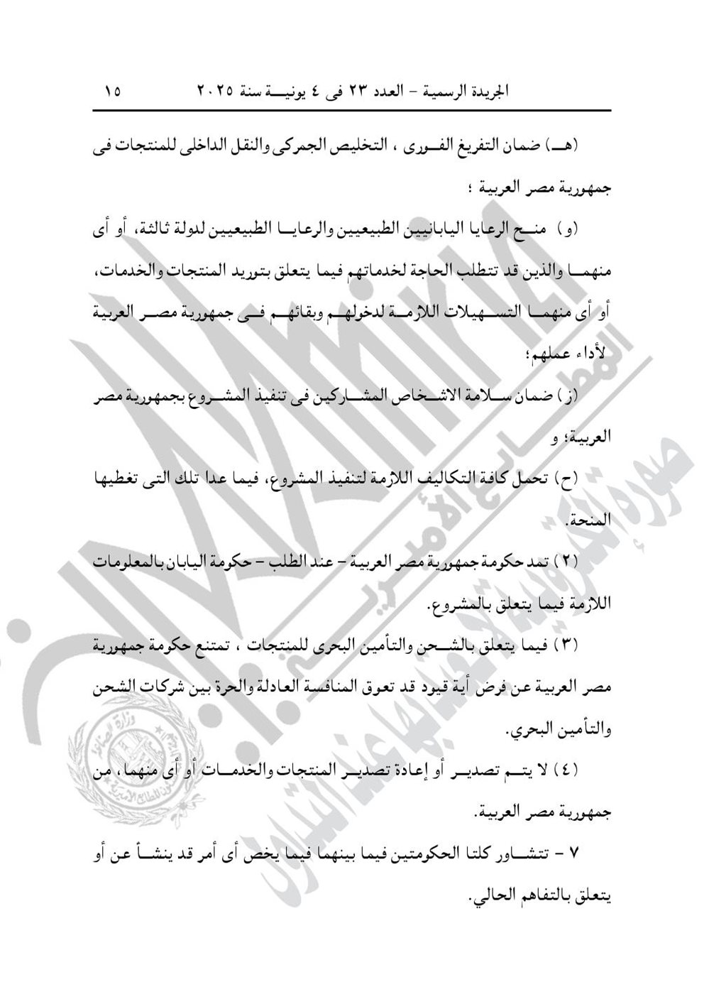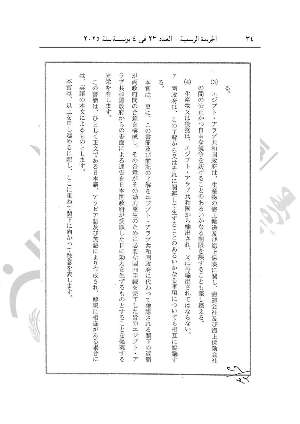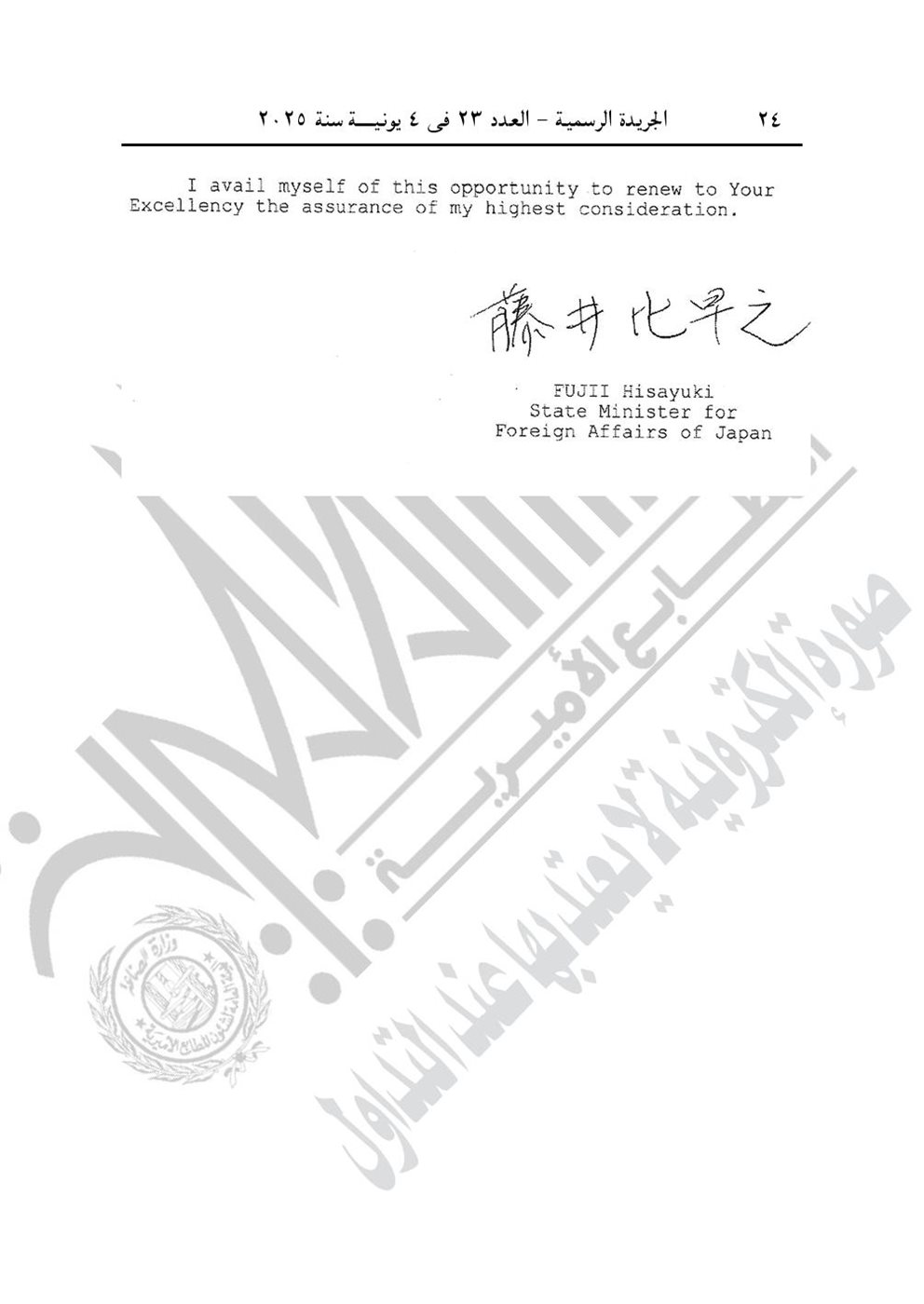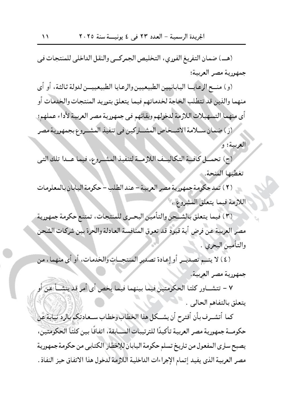 - قرار رئيس الجمهورية رقم 33 لسنة 2025، بشأن الموافقة على "الخطابات المتبادلة الخاصة بمنحة مشروع تحسين المعدات للمركز الثقافى القومى (دار الأوبرا)" بين حكومة جمهورية مصر العربية وحكومة اليابان بقيمة (180) مليون ين يابانى، وذلك مع التحفظ بشرط التصديق.