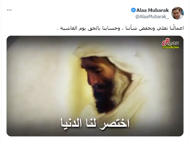 أثار مقطع فيديو نشره علاء مبارك، نجل الرئيس الراحل حسني مبارك، ردود أفعال واسعة بين نشطاء مواقع التواصل الاجتماعي، حيث بث مقطع للشاعر العربي أبو العتاهية، ومنها بيت عن الأعمال التي تعلي وتخفض الشأن، وأن الحساب بالحق سيكون يوم القيامة.