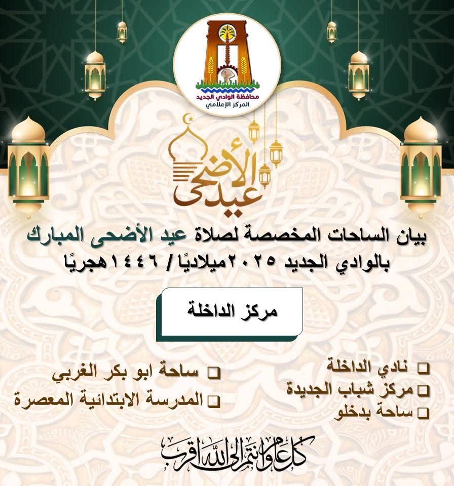 كما أعلن محافظ الوادي الجديد، الانتهاء من تجهيز وفرش 17 ساحة كبرى و606 مساجد؛ لأداء صلاة عيد الأضحى المبارك على مستوى مراكز المحافظة، وتحديد إمام وخطيب بكل مسجد وساحة؛ لأداء الشعائر بالتنسيق مع وزارة الأوقاف.