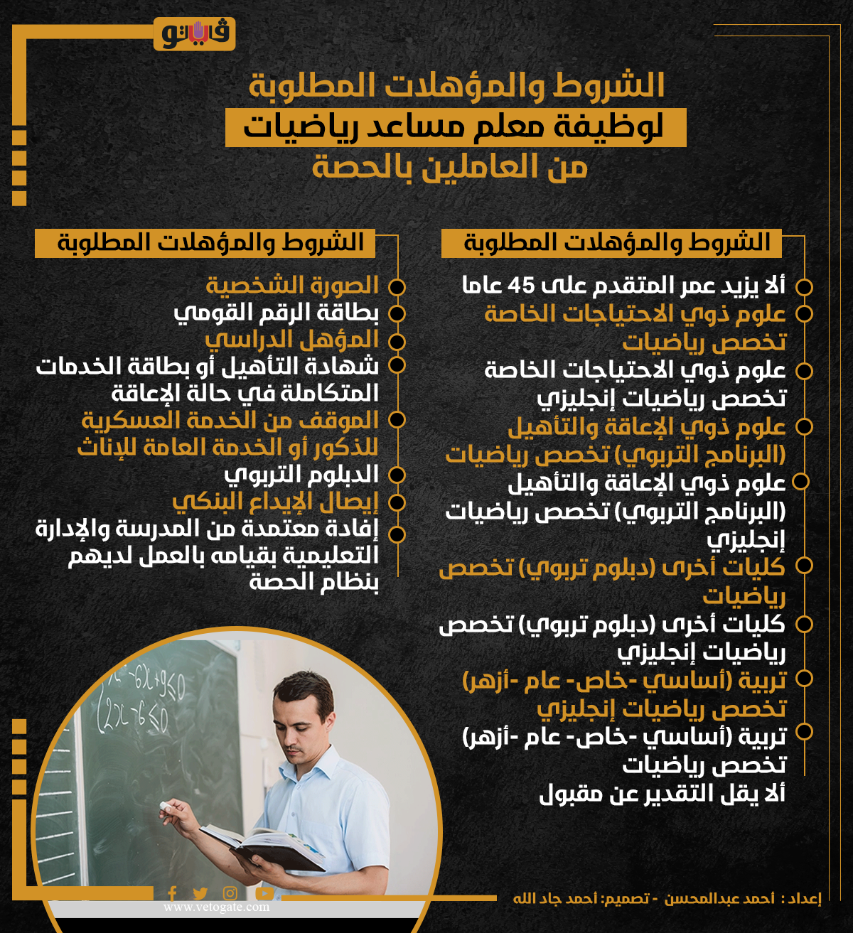 الشروط والمؤهلات المطلوبة لوظيفة معلم مساعد رياضيات من العاملين بالحصة (إنفوجراف)