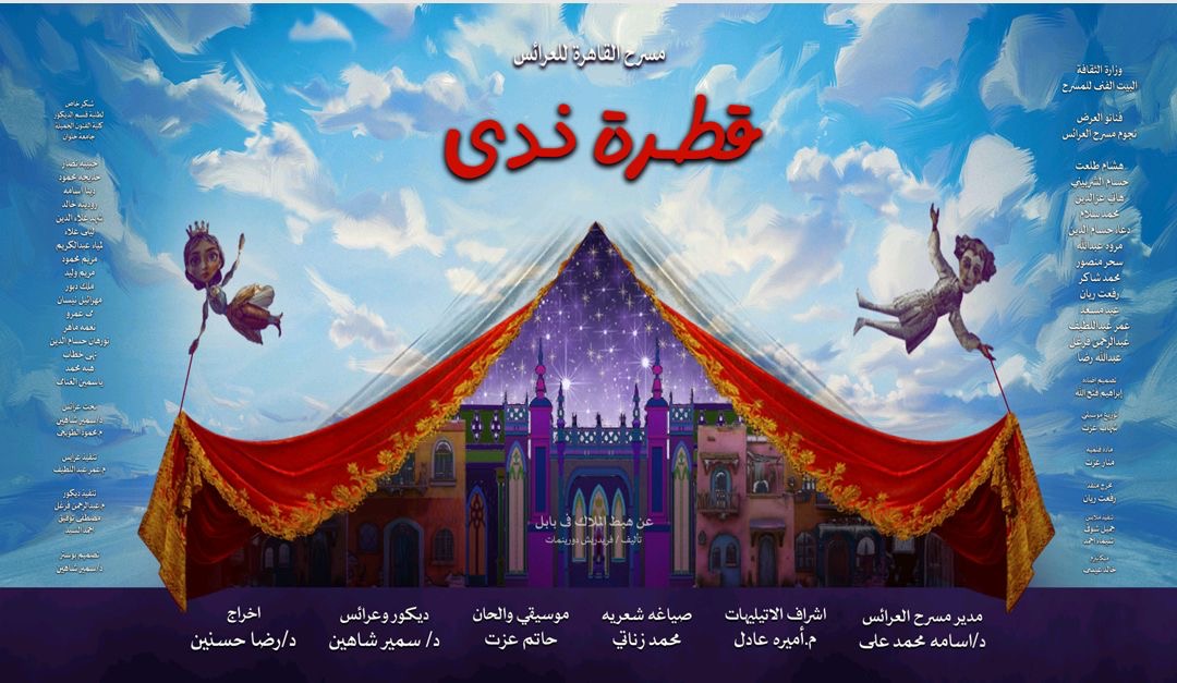 كما تقدم فرقة مسرح القاهرة للعرائس عرض “قطرة ندى”من إخراج رضا حسانين، في الثامنة مساءً على مسرح القاهرة للعرائس.