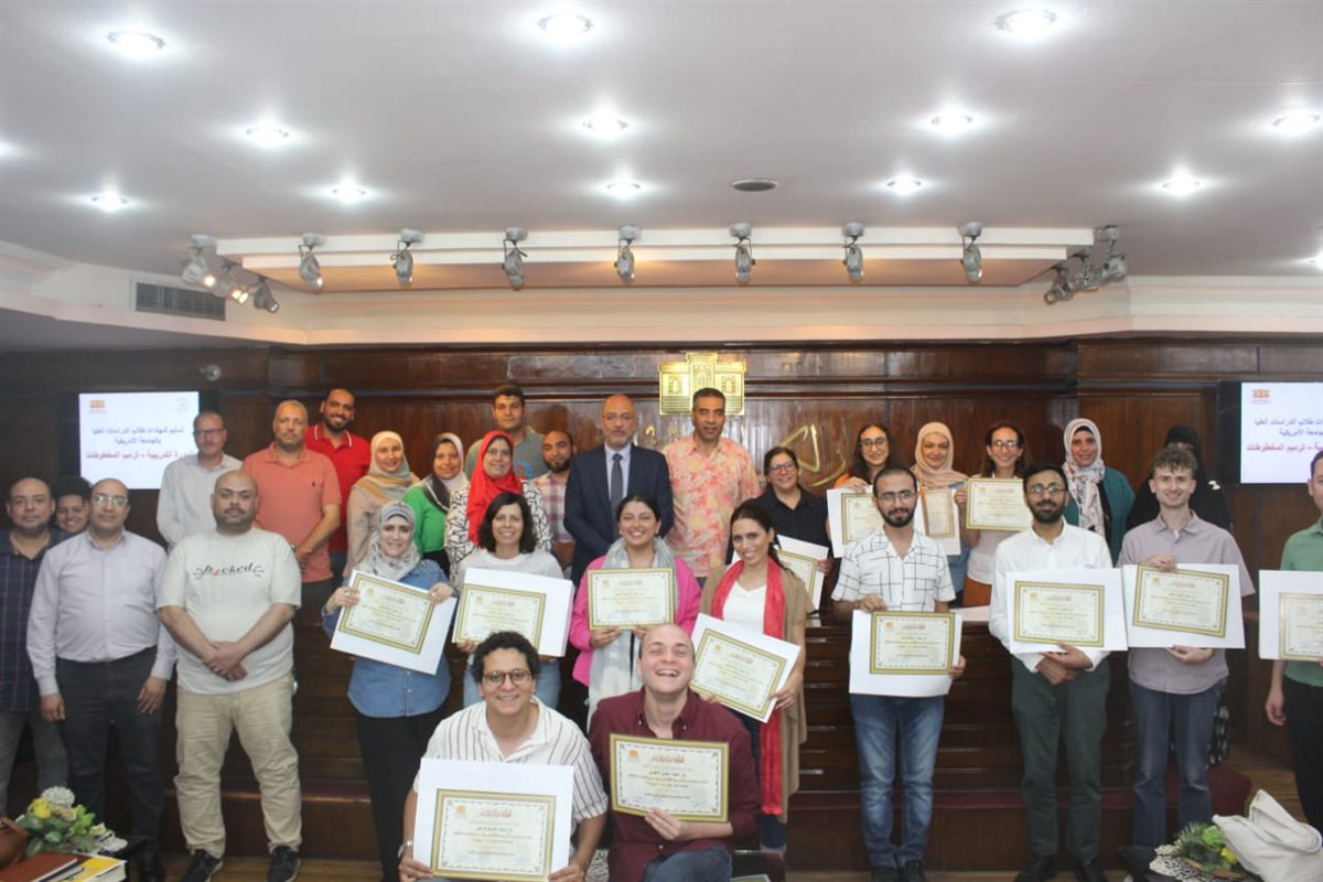 واختتمت الدورة بحفل توزيع شهادات التدريب بحضور شريف صالح رئيس الإدارة المركزية للشئون المالية والإدارية، الدكتور أشرف قادوس رئيس الإدارة المركزية للمراكز العلمية، مرفت محمد علي مدير عام المركز، الدكتورة أمينة البنداري رئيس قسم الشيخ حسن عباس شربتلي للحضارات العربية والإسلامية بالجامعة الأمريكية بالقاهرة، والدكتورة نهى أبو خطوة عضو هيئة التدريس بالقسم.
