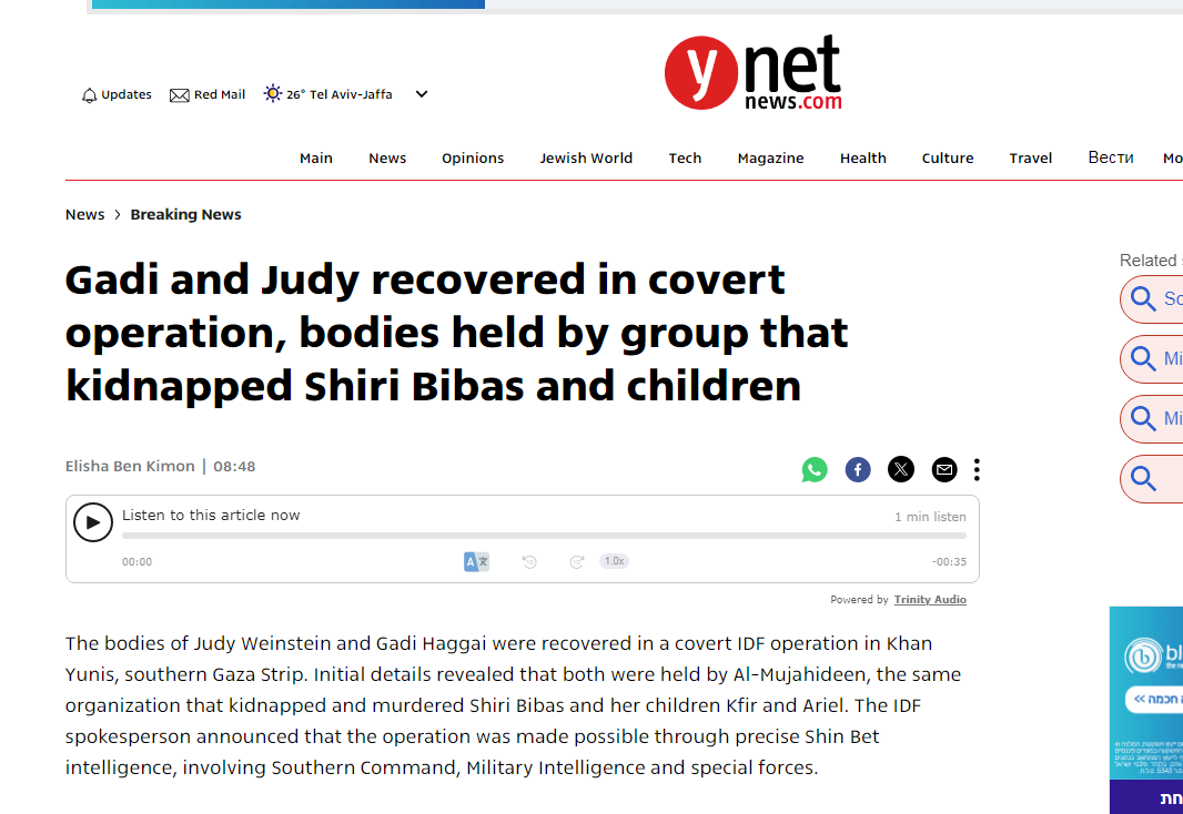 كما زعمت صحيفة "يديعوت أحرونوت" العبرية أن جيش الاحتلال عثر على جثماني جادي حجاي وجودي وينشتاين في عملية سرية، بحسب إدعائها، وأن الجثتين كان قد تم احتجازهما من قبل المقاومة، من المجموعة التي اختطفت شيري بيباس، بحسب زعمهم.