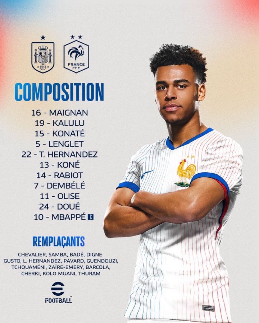 فيما سجل أهداف فرنسا كل من: مبابي في الدقيقة 59 من ركلة جزاء وريان شرقي في الدقيقة 79 ودانيا فيفيان لاعب منتخب إسبانيا بالخطأ في مرماه بالدقيقة 84 ومواني في الدقيقة 90+3.