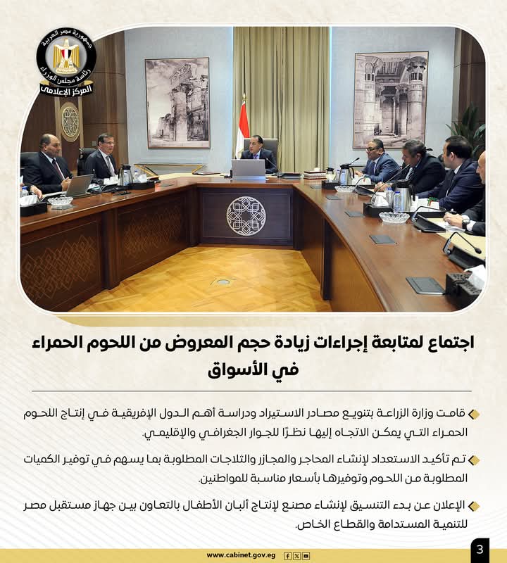 وأكد أنه تم إجراءات حكومية لزيادة المعروض من اللحوم الحمراء في الأسواق وتم إطلاق خدمات الجيل الخامس للهاتف المحمول في مصر رسميًا.