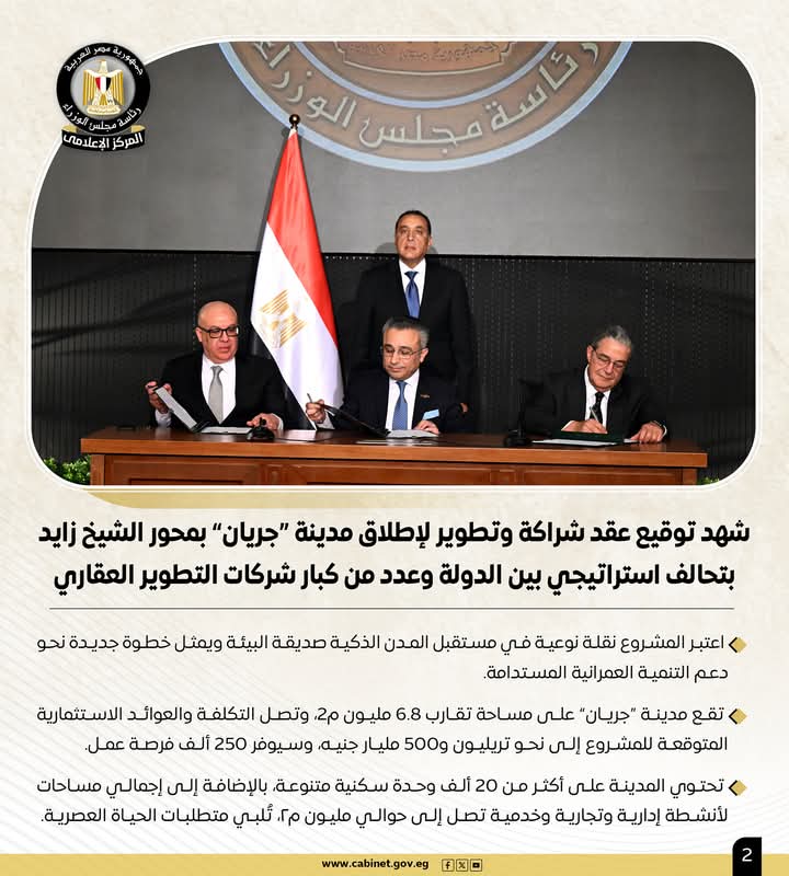 وأشار المركز الإعلامي لمجلس الوزارة أنه سيتم توفير 250 ألف فرصة عمل يوفرها مشروع "جريان".