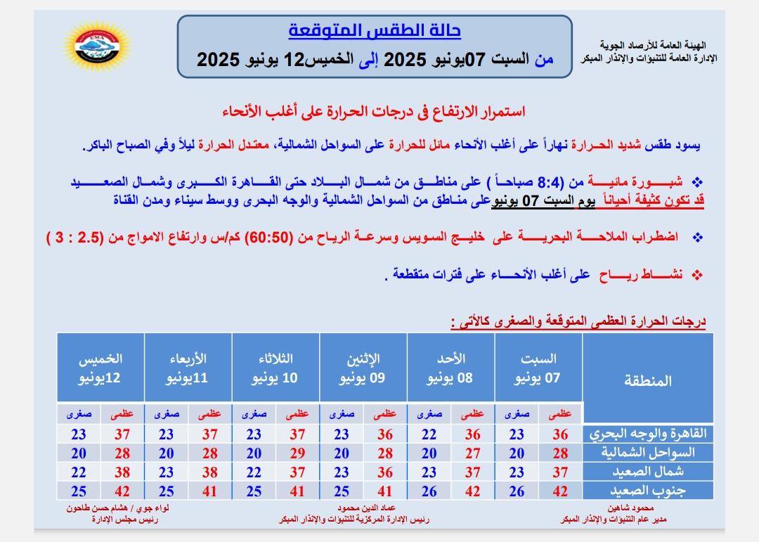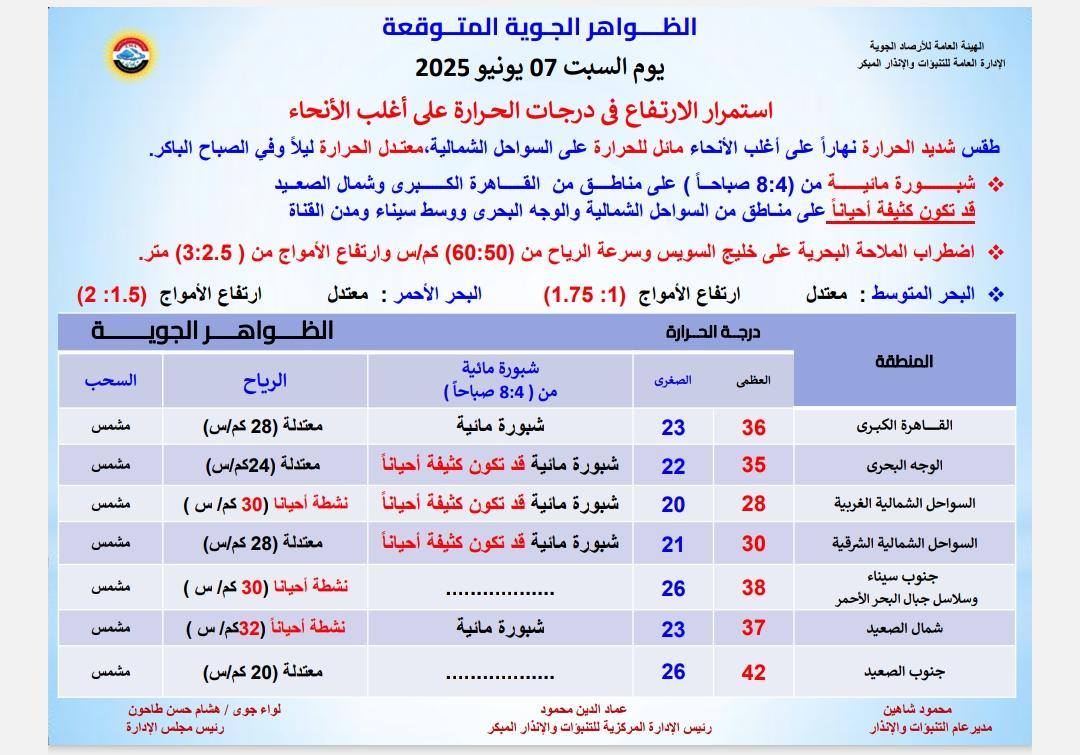 ومن المتوقع أن يسود طقس شديد الحرارة نهارًا على القاهرة الكبرى وعلى الوجه البحري ومائل للحرارة على السواحل الشمالية وشديد الحرارة على شمال الصعيد وجنوب الصعيد وجنوب سيناء.