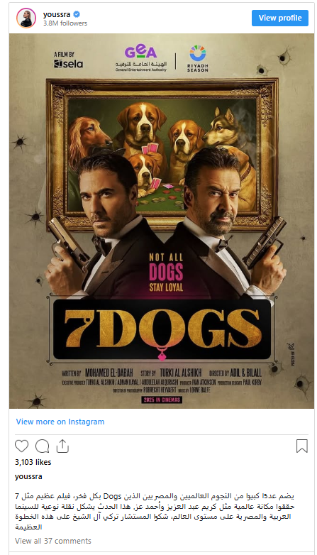 وكتبت يسرا "بكل فخر، فيلم عظيم مثل 7 Dogs يضم عددًا كبيرًا من النجوم العالميين والمصريين الذين حققوا مكانة عالمية مثل كريم عبد العزيز وأحمد عز. هذا الحدث يشكل نقلة نوعية للسينما العربية والمصرية على مستوى العالم، شكرًا المستشار تركي آل الشيخ على هذه الخطوة العظيمة".