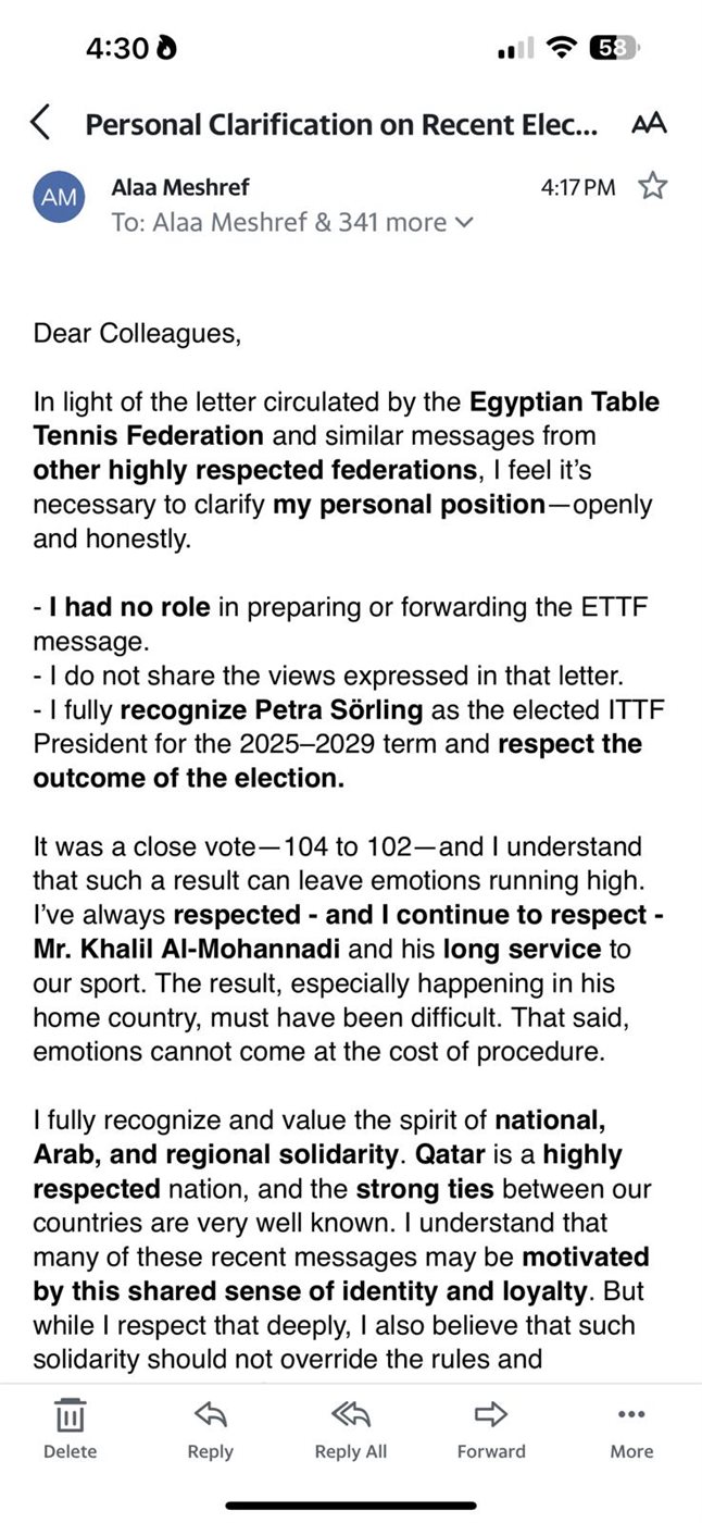وأعترف تماما أن ببترا سورلينج كرئيس منتخب لـ ITTF لفترة 2025-2029 وأحترم نتيجة الانتخابات.