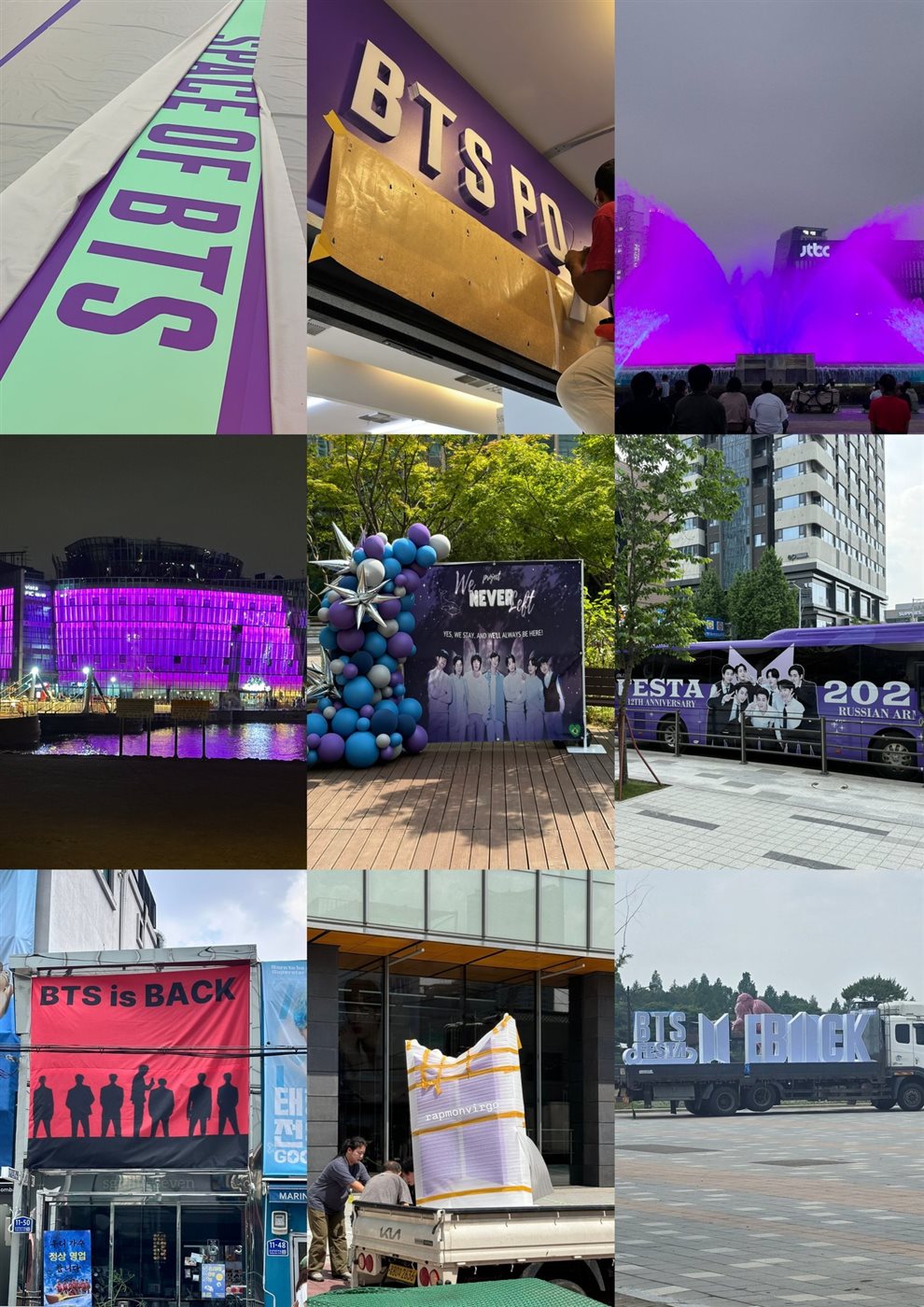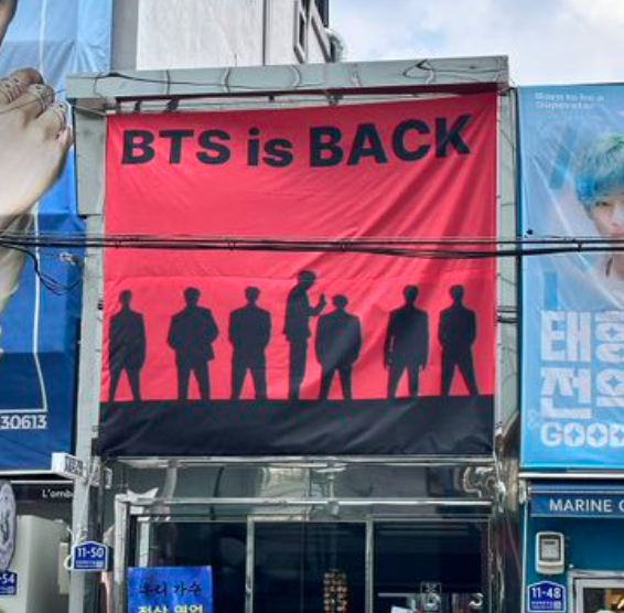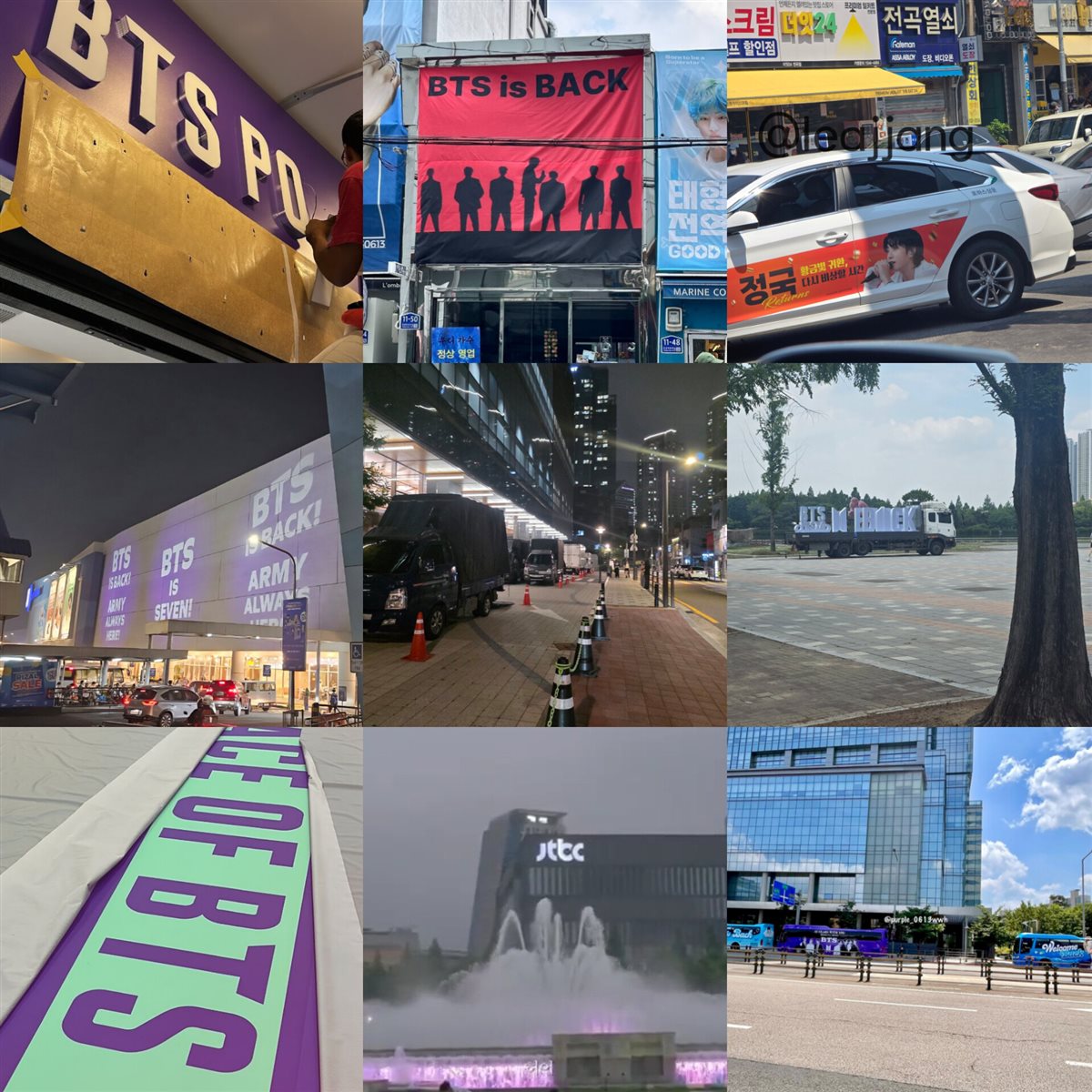كما تلونت كوريا على مدار اليومين الماضيين باللون الأرجواني سواء من اعلانات المعجبين المدفوعة لترقبهم لعودة الفرقة أو من المؤسسات والمنظمات الحكومية التي تعتبر فرقة BTS كنز قومي وأحد أكبر مصادر العملة الاجنبية.