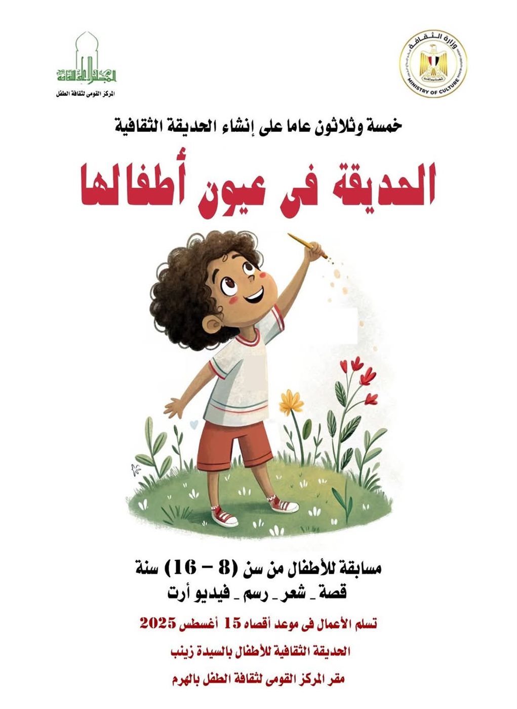 و أخر موعد لتسليم جميع الأعمال فى المسابقة (قصة – شعر – رسم - فيلم) ١٥ أغسطس ٢٠٢٥.