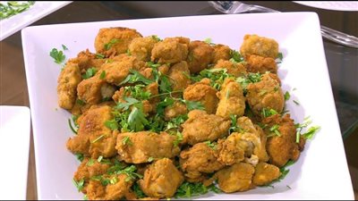 - رصى المخ المقلي في طبق التقديم، وزينيه بالبقدونس المفروم وشرائح الليمون.