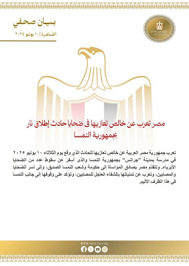 أعربت جمهورية مصر العربية عن خالص تعازيها للحادث الذي وقع اليوم في مدرسة بمدينة "جراتس" بجمهورية النمسا، والذى أسفر عن سقوط عدد من الضحايا الأبرياء.