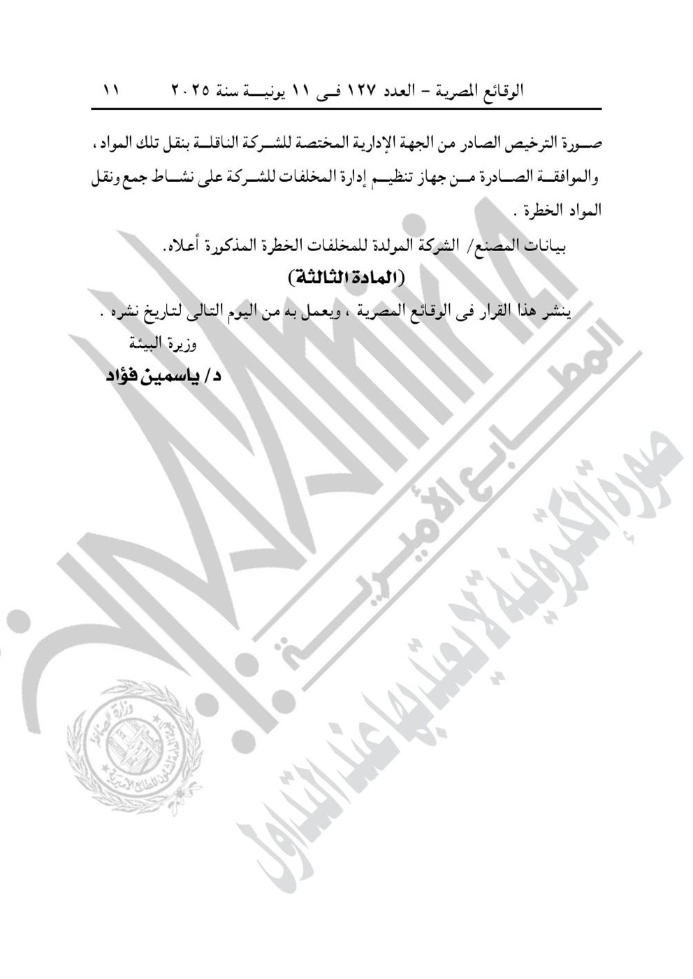 نشرت جريدة الوقائع المصرية في عددها رقم 127، الصادر في 11 يونيو 2025، قرارين جديدين لوزارة البيئة، بشأن تصدير المواد والمخلفات الخطرة وغير الخطرة.