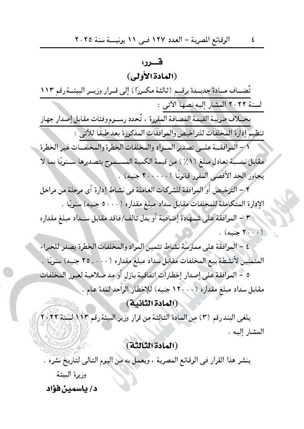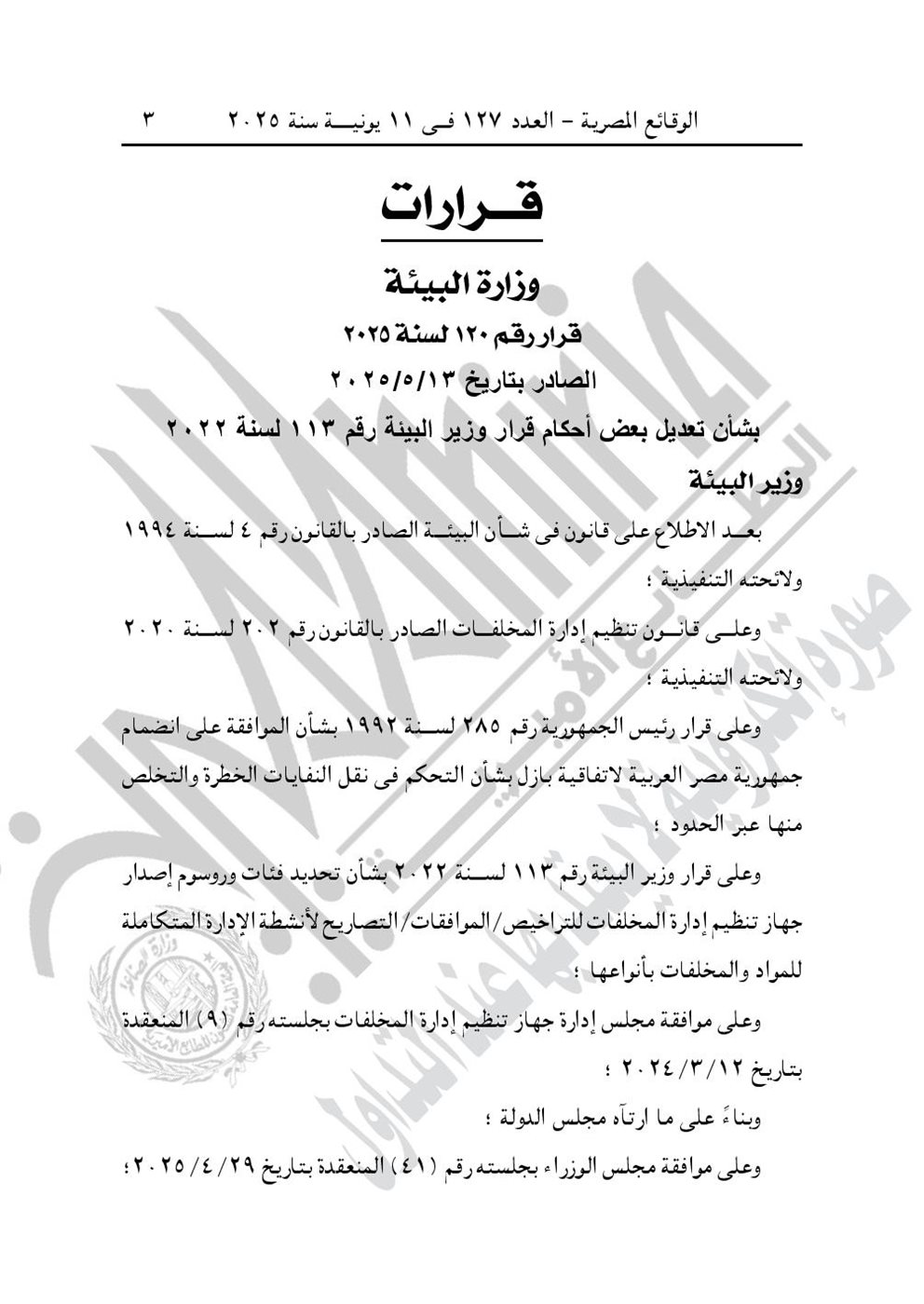 -قرار وزارة البيئة رقم 120 لسنة 2025، بشأن بشأن تعديل بعض أحكام قرار وزير البيئة رقم 113 لسنة 2022، حيث تضاف مادة جديدة برقم(ثالثة مكررًا) إلى قرار وزير البيئة رقم 113 لسنة 2022 المشار إليه نصها الآتي: بخلاف ضريبة القيمة المضافة المقررة، تحدد رسوم وفئات مقابل إصدار جهاز تنظيم إدارة المخلفات للتراخيص والموافقات المذكورة بعد طبقا للآتي: