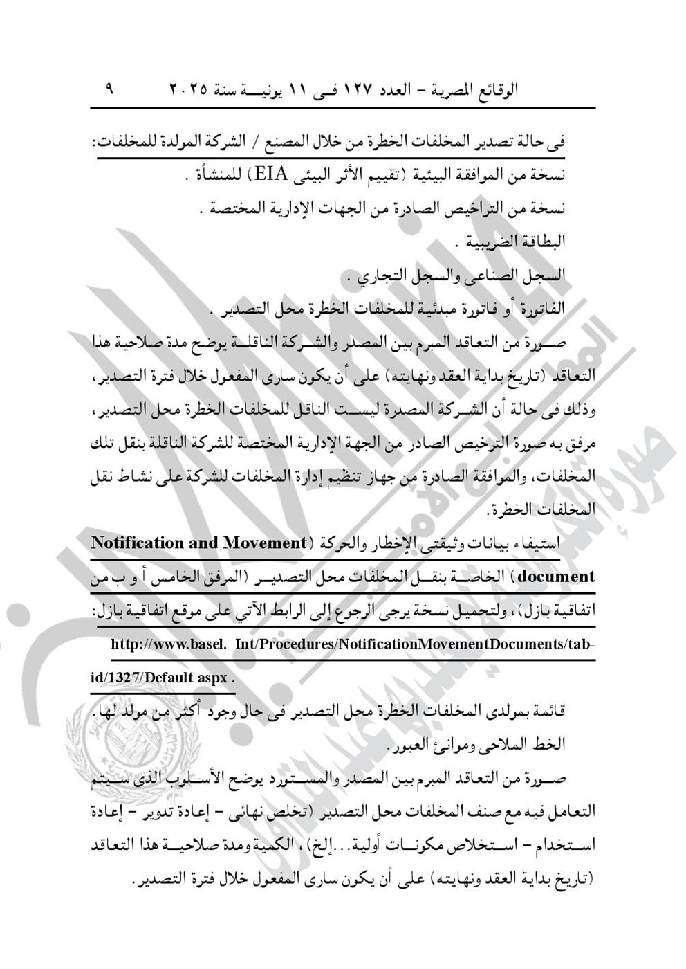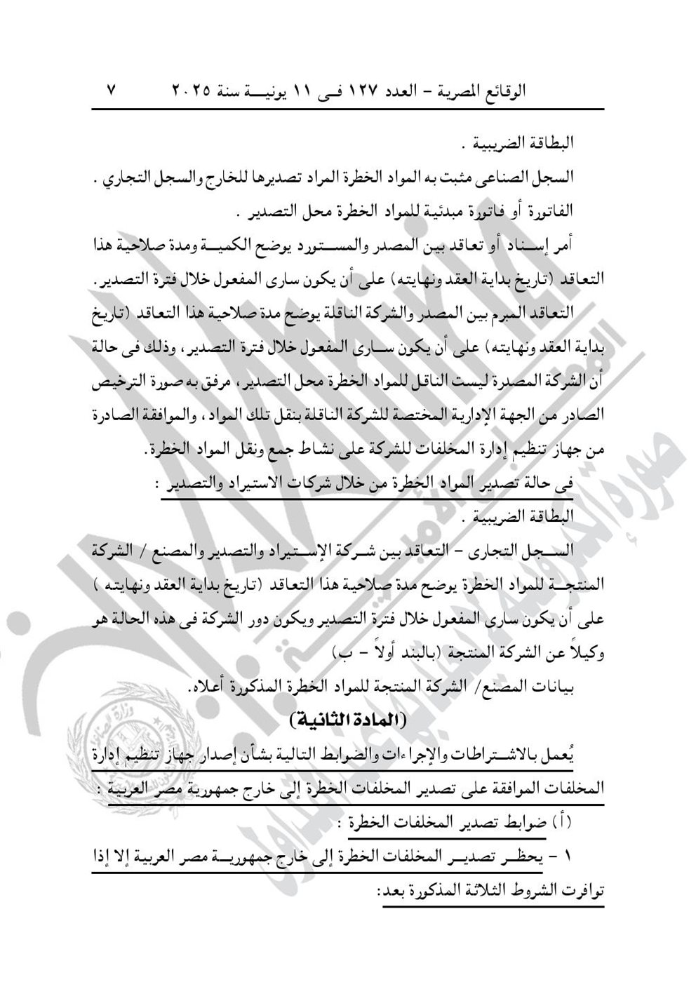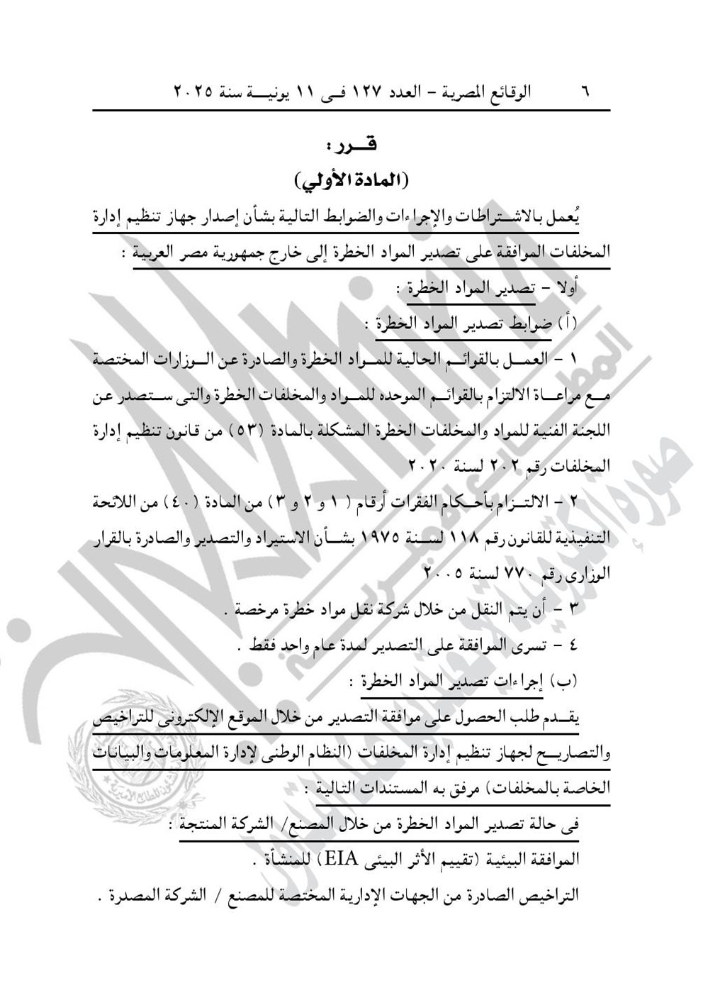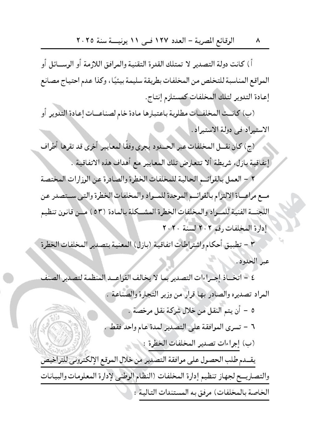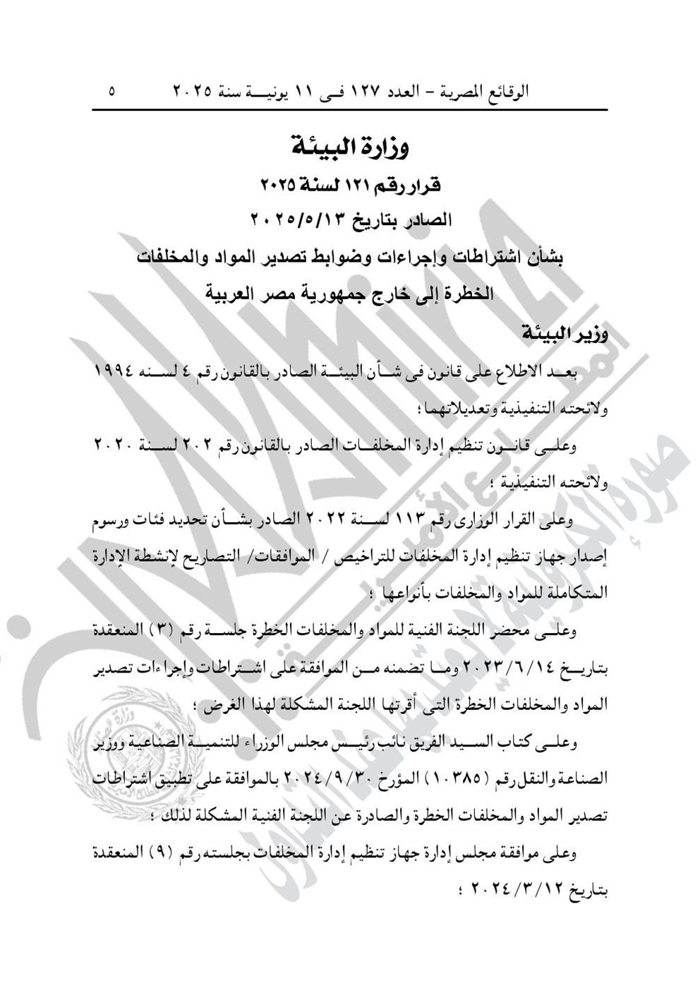 - قرار وزارة البيئة رقم 121 لسنة 2025، بشأن اشتراطات وإجراءات وضوابط تصدير المواد والمخلفات الخطرة إلى خارج جمهورية مصر العربية، حيث يعمل بالاشتراطات والإجراءات والضوابط التالية بشأن إصدار جهاز تنظيم إدارة المخلفات الموافقة على تصدير المواد الخطرة إلى خارج جمهورية مصر العربية: