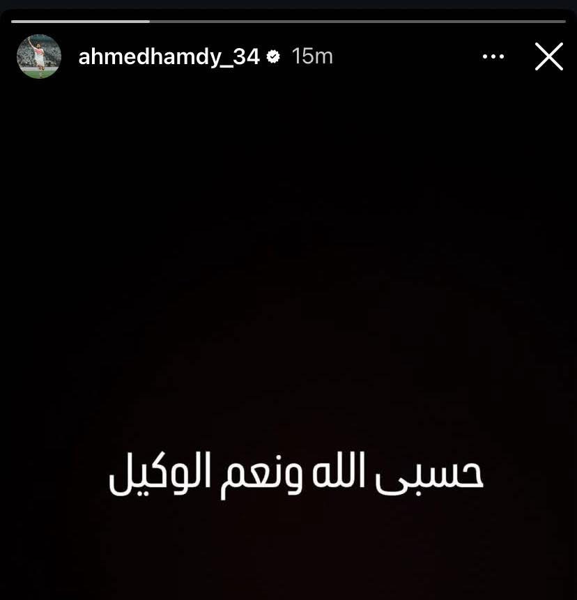 أثار أحمد حمدي، لاعب وسط نادي الزمالك، حالة من الجدل بين جماهير القلعة البيضاء بعد نشره تدوينة مقتضبة عبر حسابه الشخصي على موقع “إنستجرام”، كتب فيها: “حسبي الله ونعم الوكيل”، دون توضيح الأسباب.
