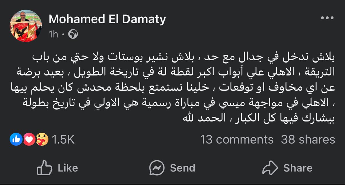 وقال الدماطي عبر حسابه الشخصي: "بلاش ندخل في جدال مع حد، بلاش نشير بوستات ولا حتى من باب التريقة، الأهلي على أبواب أكبر لقطة له في تاريخه الطويل، بعيد برضة عن أي مخاوف أو توقعات، خلينا نستمتع بلحظة محدش كان يحلم بيها، الأهلي في مواجهة ميسي في مباراة رسمية هي الأولى في تاريخ بطولة بيشارك فيها كل الكبار، الحمد لله".