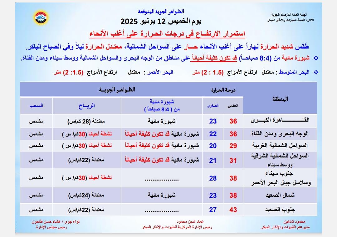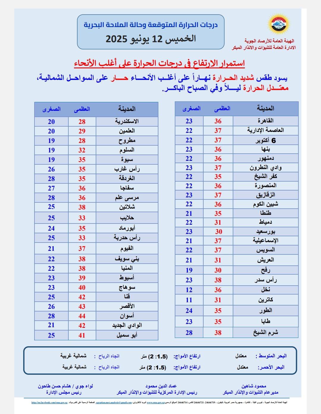 كما نشرت هيئة الأرصاد الجوية بيانا بدرجات الحرارة المتوقعة اليوم الخميس على مدن ومحافظات مصر، وجاءت كالتالي: