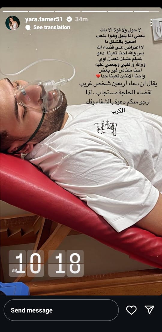 وناشدت يارا محمد الجمهور ومتابعي زوجها بالدعاء له بالشفاء العاجل، مستشهدة بمقولة "يقال إن دعاء أربعين شخص غريب لقضاء الحاجة مستجاب"، مضيفة: "لذا أرجو منكم دعوة بالشفاء وفك الكرب."