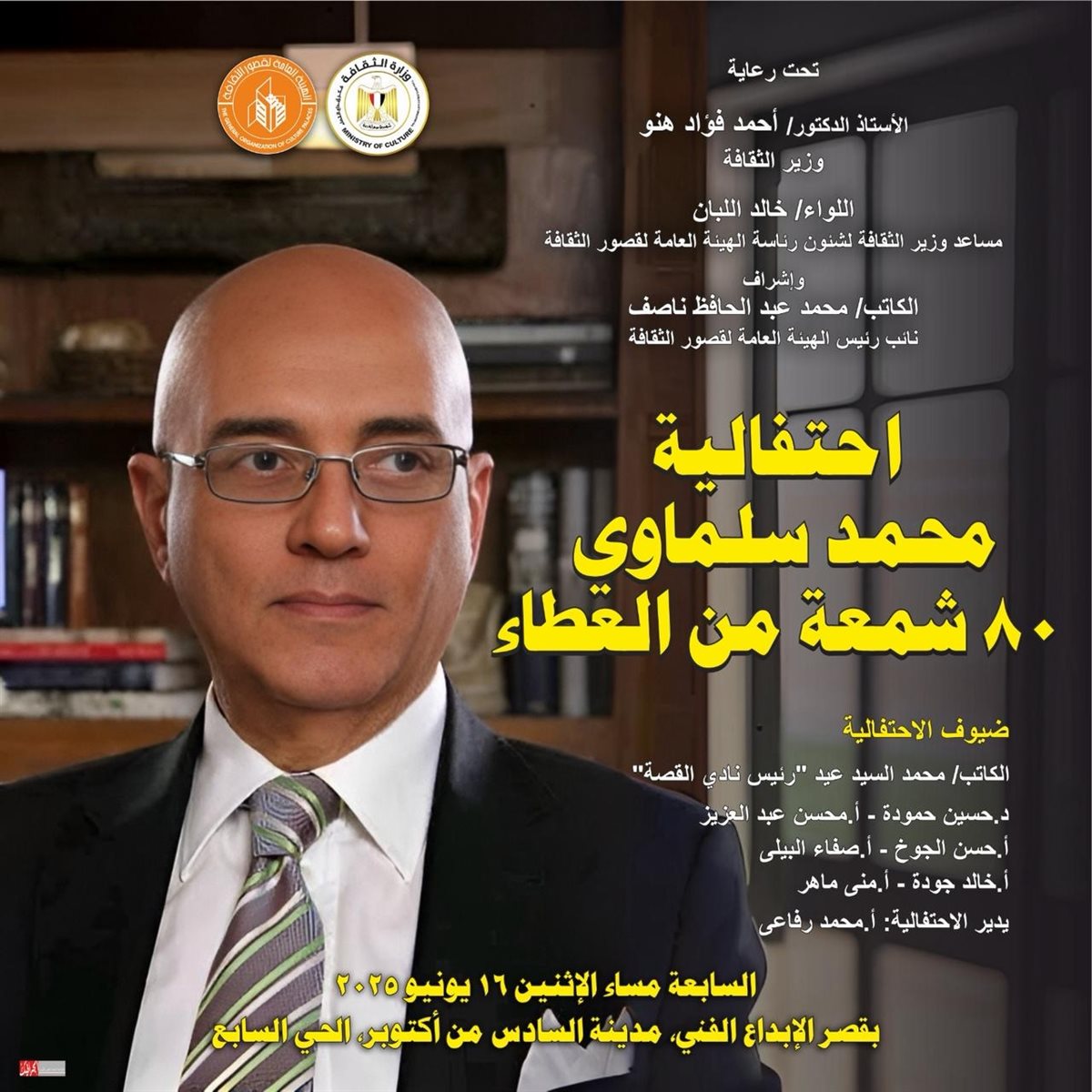 تنظم الهيئة العامة لقصور الثقافة، برئاسة اللواء خالد اللبان، لقاء بعنوان "محمد سلماوي 80 شمعة من العطاء"، في السابعة مساء الاثنين المقبل 16 يونيو، بقصر الإبداع الفني بمدينة السادس من أكتوبر، ضمن برامج وزارة الثقافة للاحتفاء برموز الفكر والإبداع.