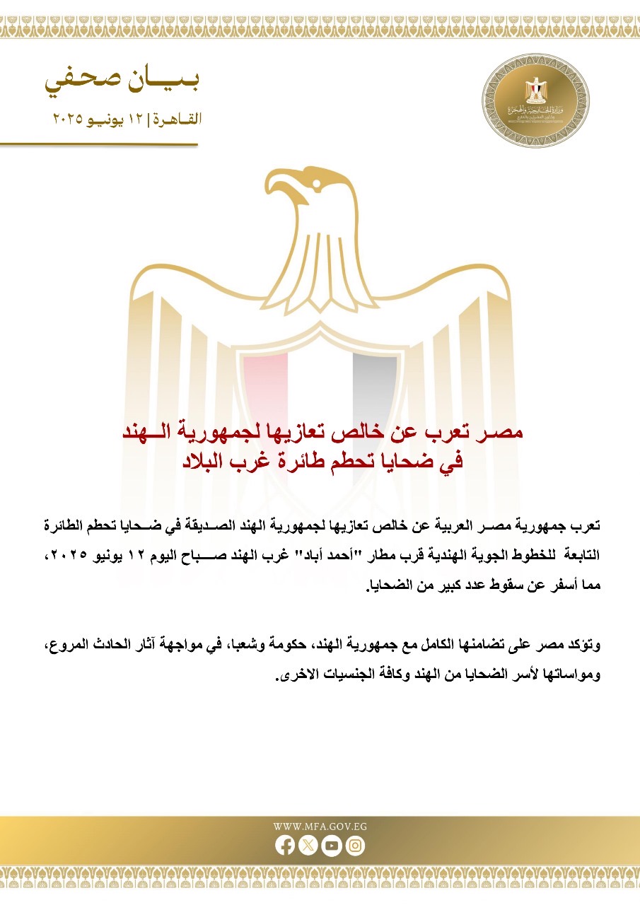 أعربت جمهورية مصر العربية عن خالص تعازيها لجمهورية الهند الصديقة في ضحايا تحطم الطائرة التابعة للخطوط الجوية الهندية قرب مطار أحمد أباد غرب الهند صباح اليوم، مما أدى إلى سقوط عدد كبير من الضحايا.