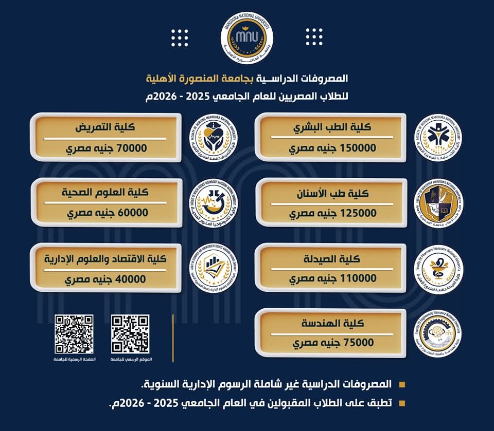 أعلنت جامعة المنصورة الأهلية المصروفات الدراسية للطلاب الجدد الملتحقين بالكليات التابعة في العام الجامعي 2025-2026.