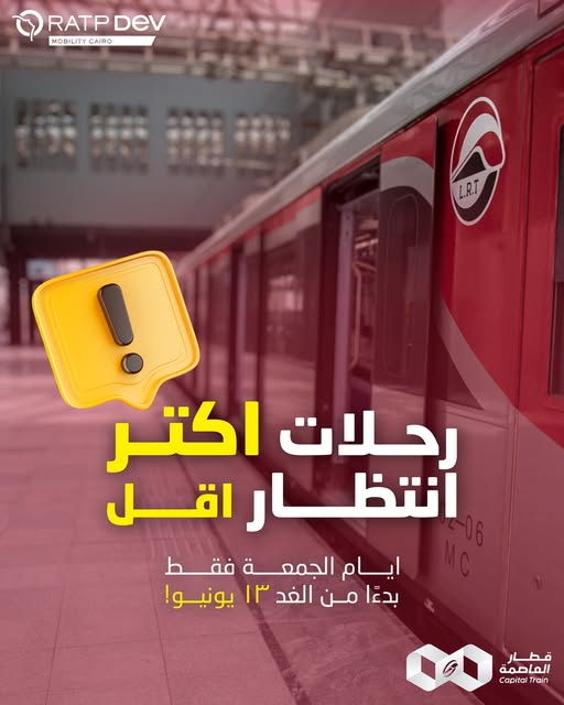 استجابةً لمطالب الركاب وحرصًا منّا على تحسين الخدمة باستمرار بقطار العاصمة، رحلات أكتر ووقت انتظار أقل كل يوم جمعة، ابتداءً من 13 يونيو!