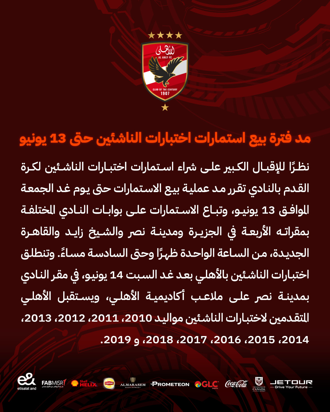 اختبارات الناشئين 2025، قرر النادي الأهلي، مد فترة بيع استمارات اختبارات الناشئين لمدة 24 ساعة إلى اليوم الجمعة 13 يونيو الجاري بسبب الإقبال الكبير.