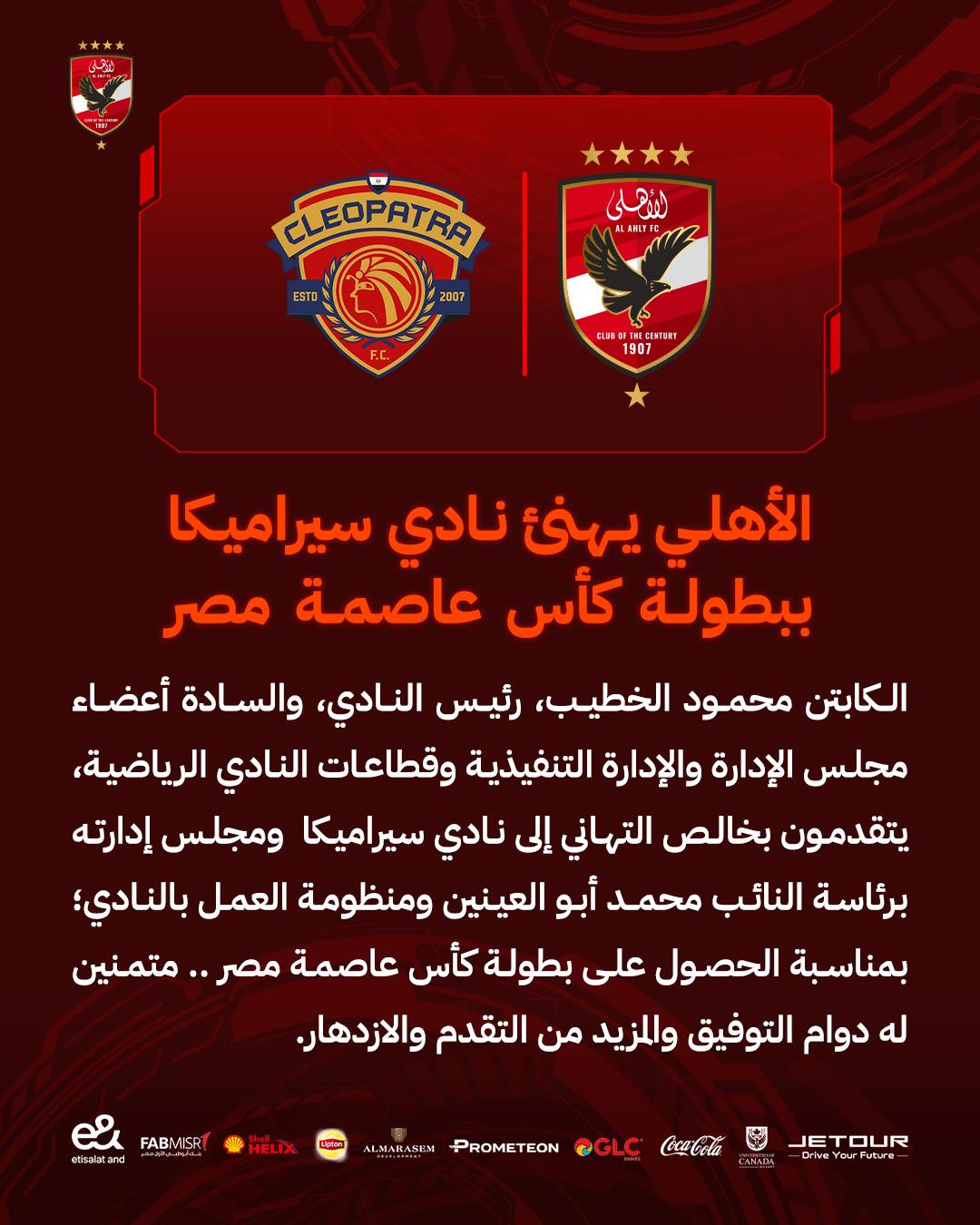قام مجلس إدارة النادي الأهلي برئاسة محمود الخطيب رئيس المجلس بتهنئة نادي سيراميكا كليوباترا بعد فوزه ببطولة كأس عاصمة مصر أمس بعد الفوز على البنك الأهلي بهدفين دون رد ليحقق لقب البطولة للموسم الثالث على التوالي.