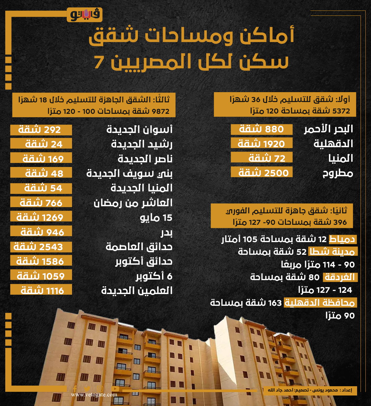 والشقق (تسليم خلال 18 شهرًا)، والتي يبلغ عددها 9872 وحدة سكنية، مطروحة في عدد من المدن الجديدة وهي، محافظة أسوان (مدينة أسوان الجديدة)، محافظة أسيوط (مدينة ناصر الجديدة غرب أسيوط)، محافظة البحيرة (مدينة رشيد الجديدة)، محافظة الجيزة (مدينة 6 أكتوبر)، محافظة الشرقية (مدينة العاشر من رمضان)، محافظة القاهرة (مدن 15 مايو- بدر- حدائق العاصمة)، محافظة المنيا (مدينة المنيا الجديدة)، محافظة بني سويف (مدينة بني سويف الجديدة)، محافظة مطروح (مدينة العلمين الجديدة).