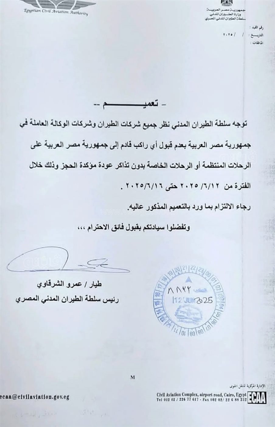 وشددت سلطة الطيران المدني المصري علي جميع شركات الطيران بعدم قبول أي راكب على متن أي رحلة جوية قادمة إلى مطار القاهرة الدولي سواء برحلة منتظمة أو خاصة بدون حجز عودة مؤكد وذلك من تاريخ 12 يونيو 2025م وحتى تاريخ 16 يونيو 2025م.