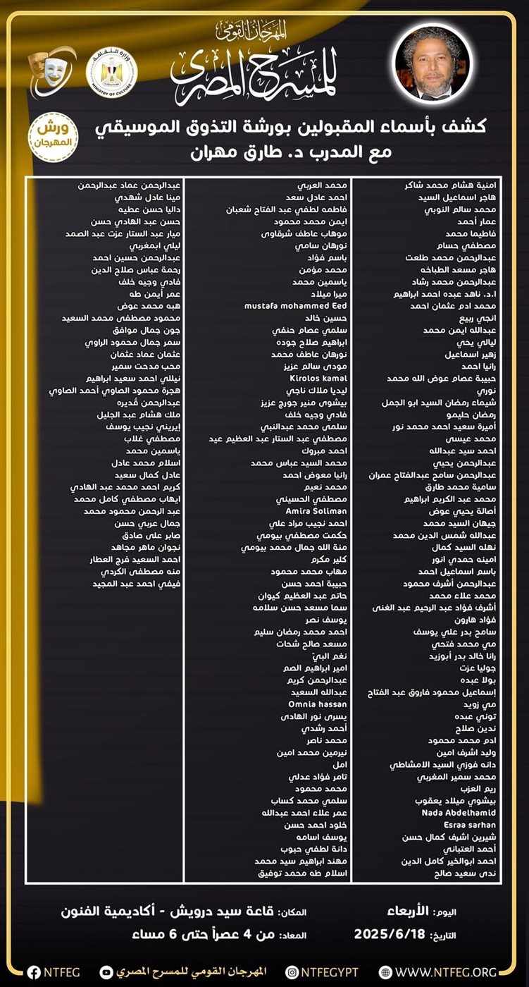 كشف المهرجان القومي للمسرح المصري في دورته الثامنة عشرة برئاسة الفنان محمد رياض، عن أسماء المتدربين المقبولين في ورشة التذوق الموسيقي، والتي يقدمها الدكتور طارق مهران، والتي من المقرر إقامتها ضمن فعاليات الدورة الجديدة.