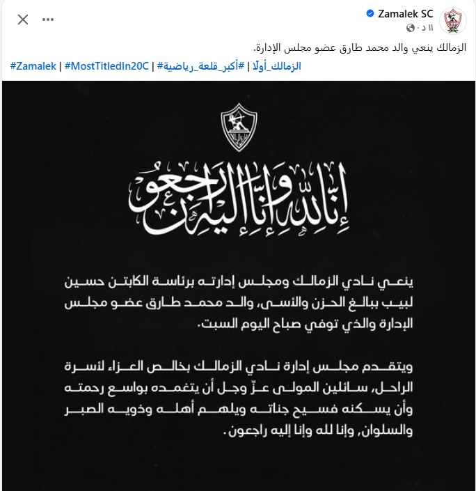 نعى نادي الزمالك عبر حسابه الرسمي محمد طارق عضو مجلس إدارة النادي بعد وفاة والده.