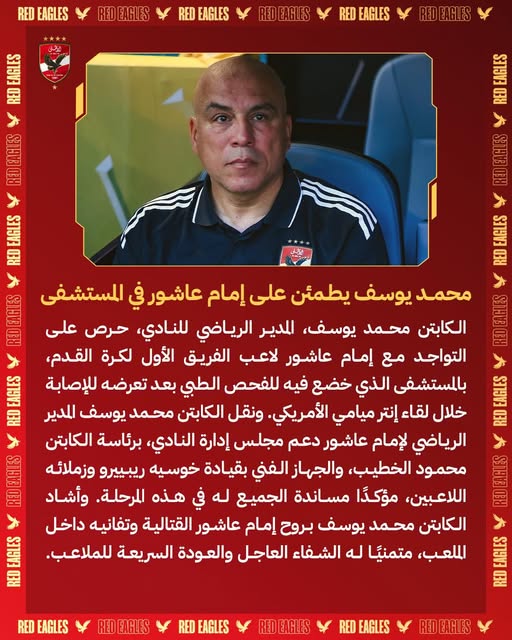 ونقل محمد يوسف المدير الرياضي لإمام عاشور دعم مجلس إدارة النادي برئاسة الكابتن محمود الخطيب، والجهاز الفني بقيادة خوسيه ريبييرو وزملائه اللاعبين، مؤكدًا مساندة الجميع له في هذه المرحلة.