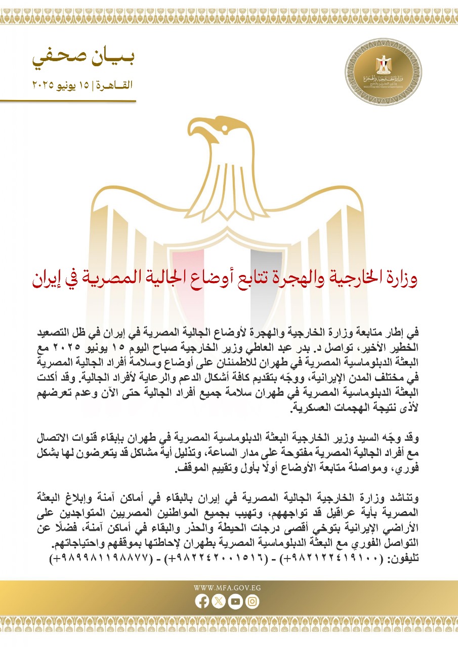 وقالت الوزارة أن ذلك جاء في إطار متابعة وزارة الخارجية والهجرة لأوضاع الجالية المصرية في إيران في ظل التصعيد الخطير الأخير.