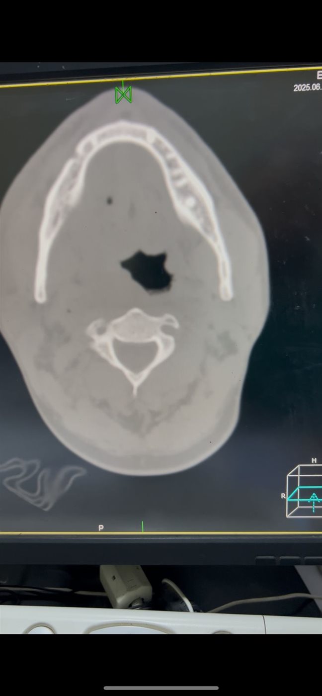 وكشفت الفحوصات والأشعة عن وجود خراج واسع الانتشار في أرضية الفم والرقبة؛ ما أدى إلى انحراف في مجرى الهواء الطبيعي، وصعوبة بالغة في تركيب أنبوب التخدير.