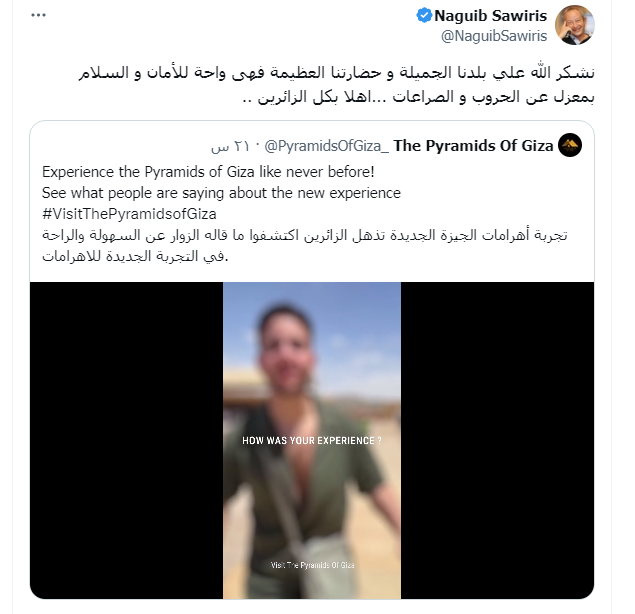 وقال المهندس نجيب ساويرس بشأن السياحة في مصر، وخاصة بمنطقة الأهرامات بعد التجديدات والتطورات الأخيرة التي لحقت بها: "نشكر الله على بلدنا الجميلة وحضارتنا العظيمة فهى واحة للأمان والسلام بمعزل عن الحروب والصراعات...أهلا بكل الزائرين.."