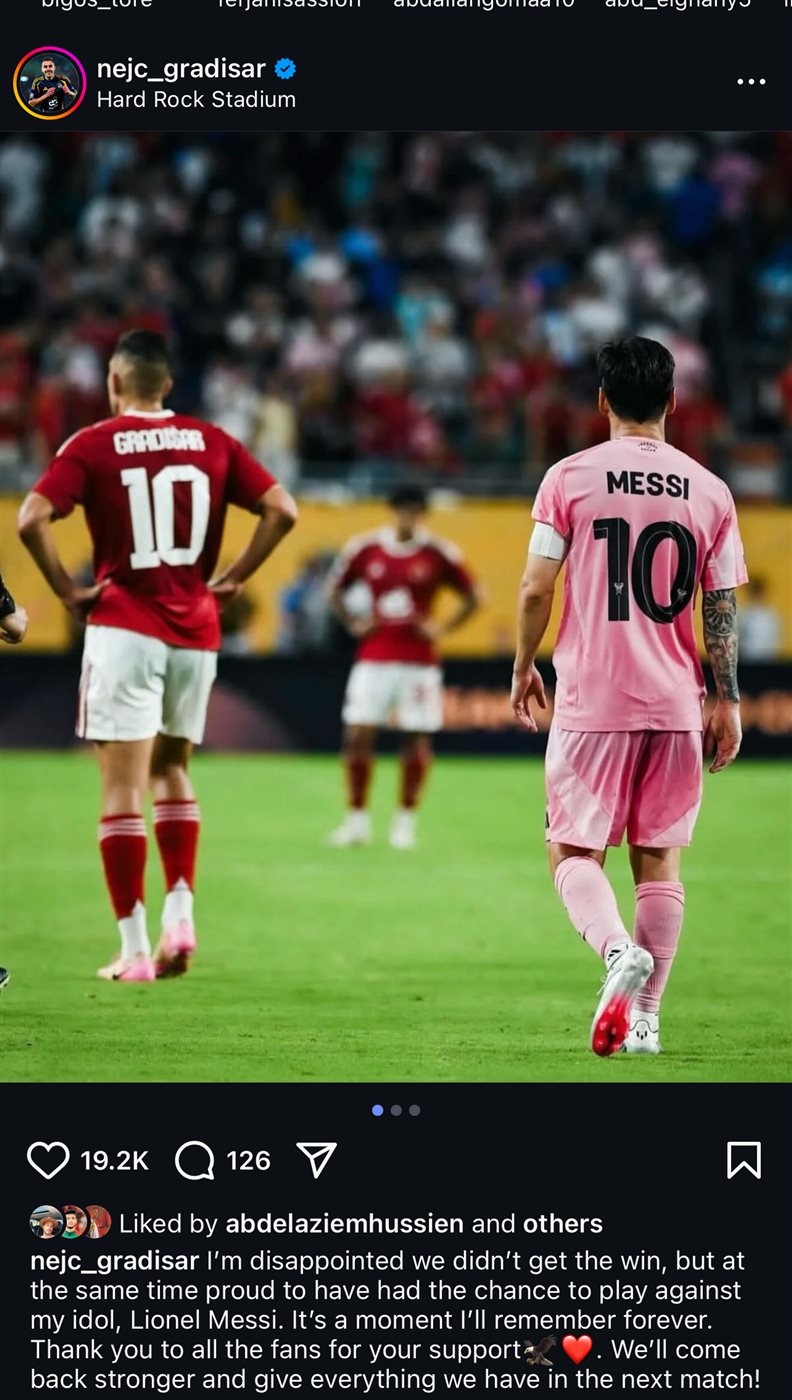 ونشر جراديشار صورا له خلال مشاركته في مباراة أنتر ميامي وقال " أشعر بخيبة أمل، لأننا لم نحقق الفوز، لكن في نفس الوقت فخور بأنني حظيت بفرصة اللعب أمام قدوتي، ليونيل ميسي، إنها لحظة لن أنساها أبدا، شكرا لكل الجماهير على دعمكم، سنعود أقوى وسنقدّم كل ما لدينا في المباراة القادمة
