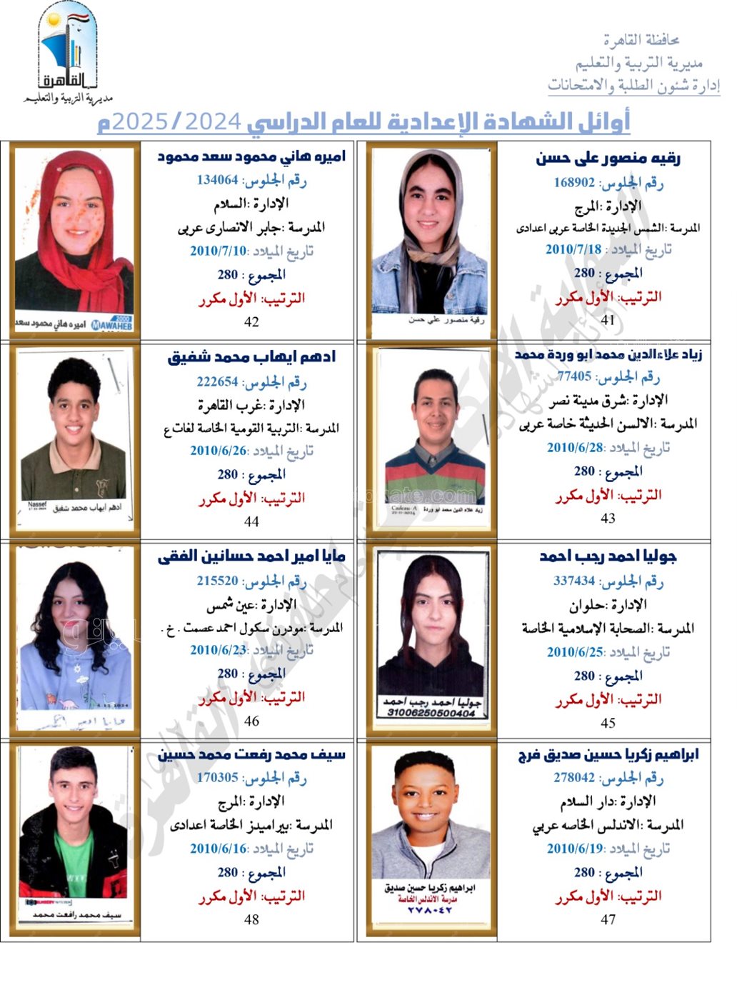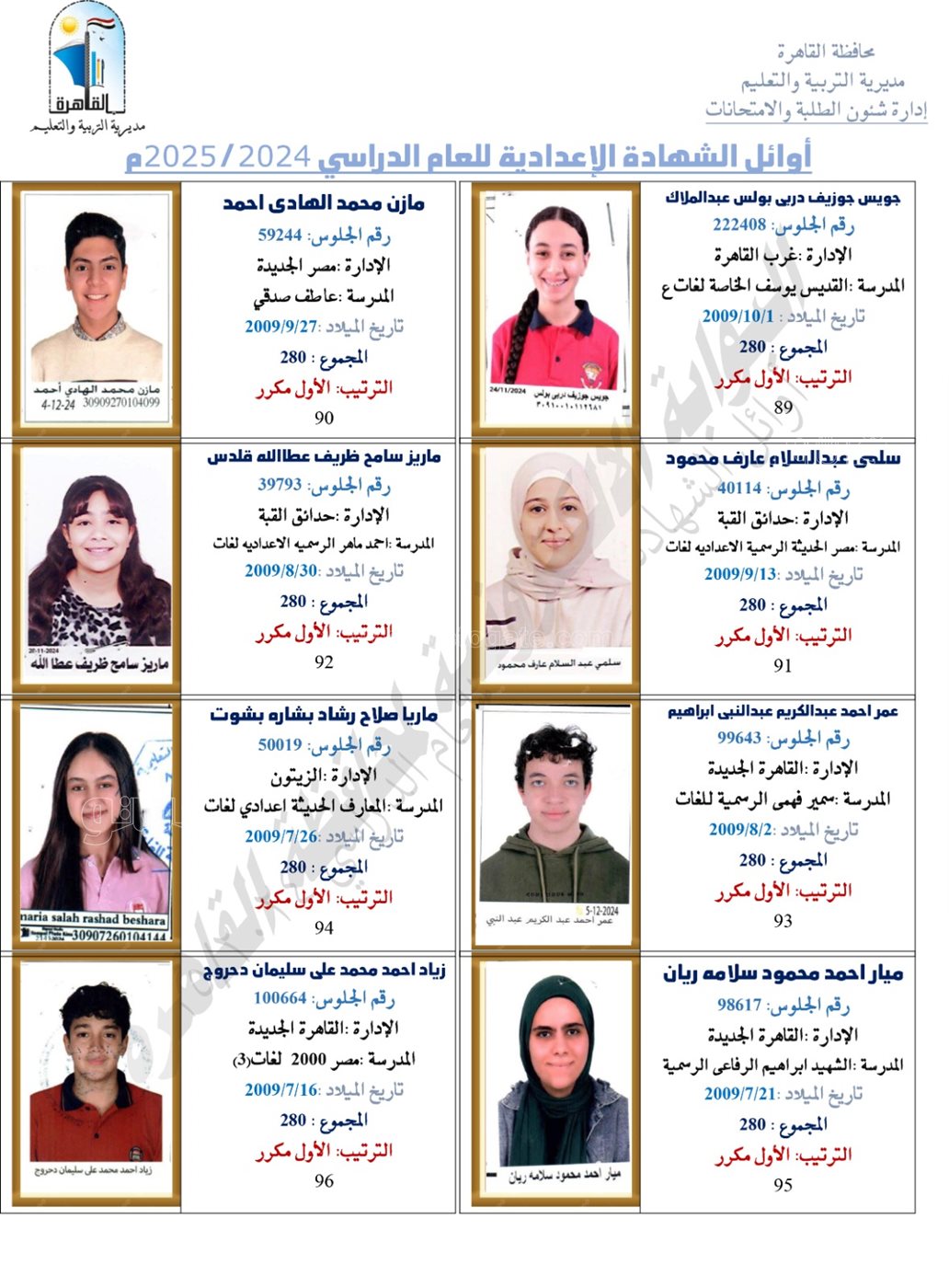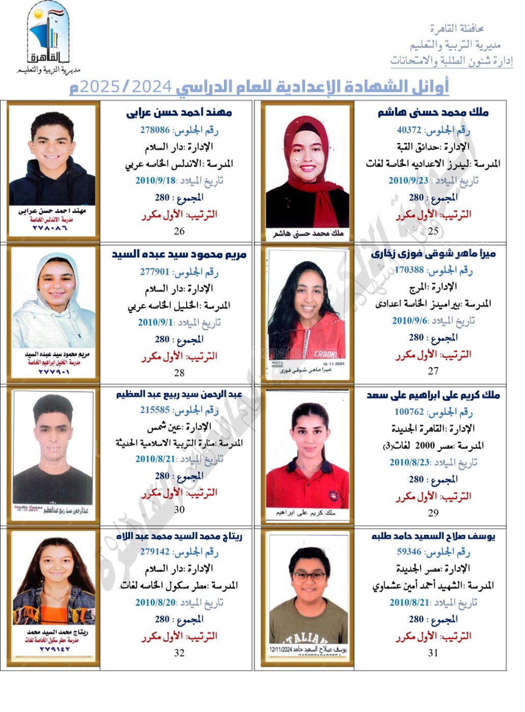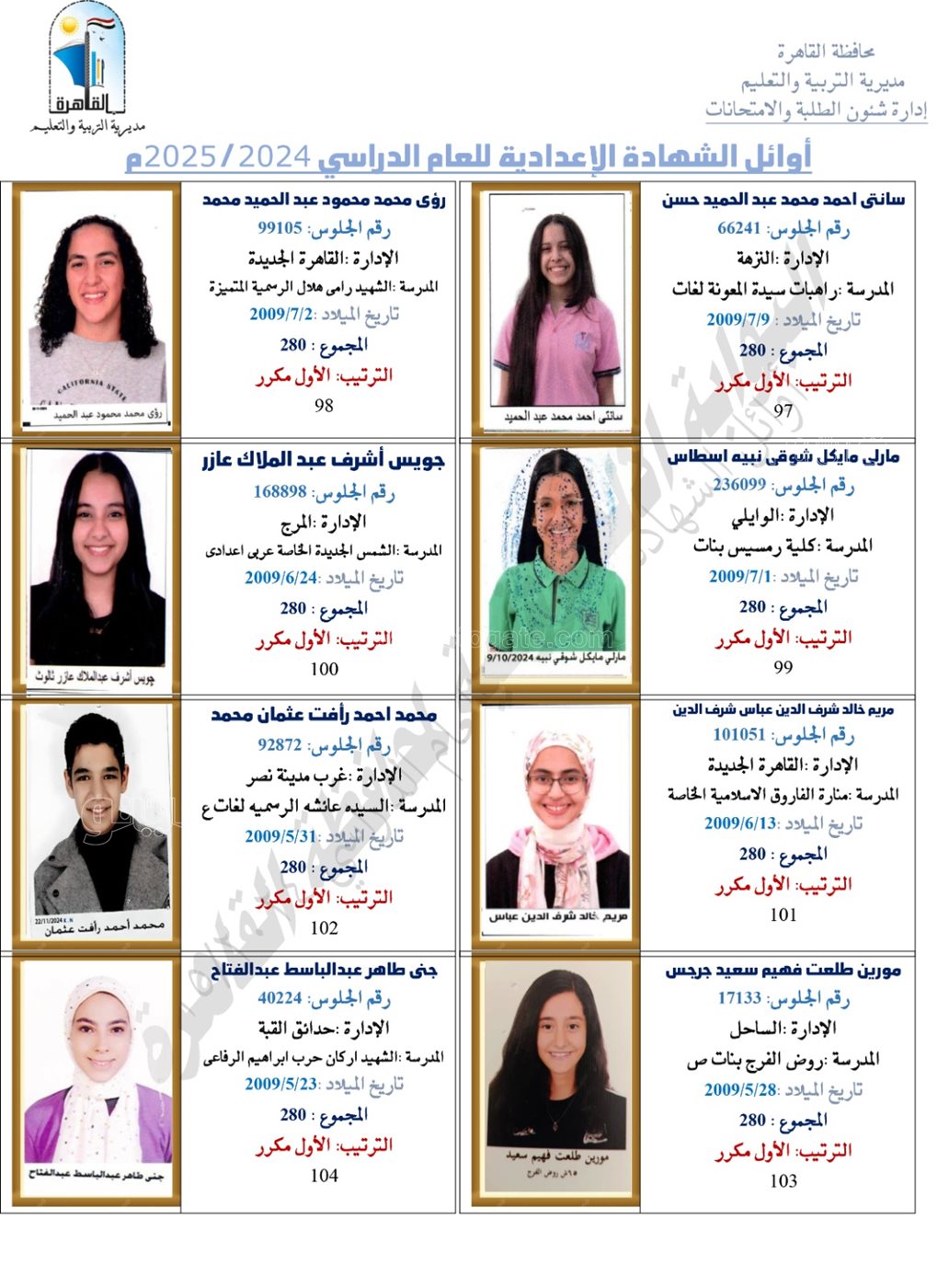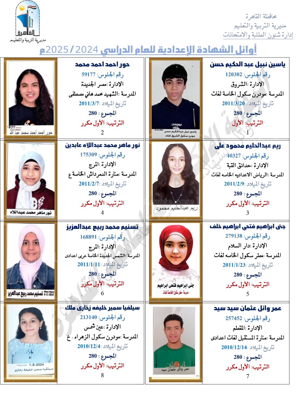 نتيجة الشهادة الإعدادية محافظة القاهرة بالاسم، أعلنت مديرية التربية والتعليم بالقاهرة، قائمة أوائل الشهادة الإعدادية 2025 بمحافظة القاهرة، بعد تعديلها من أخطاء وضع أسماء فتيات على صور بنين.