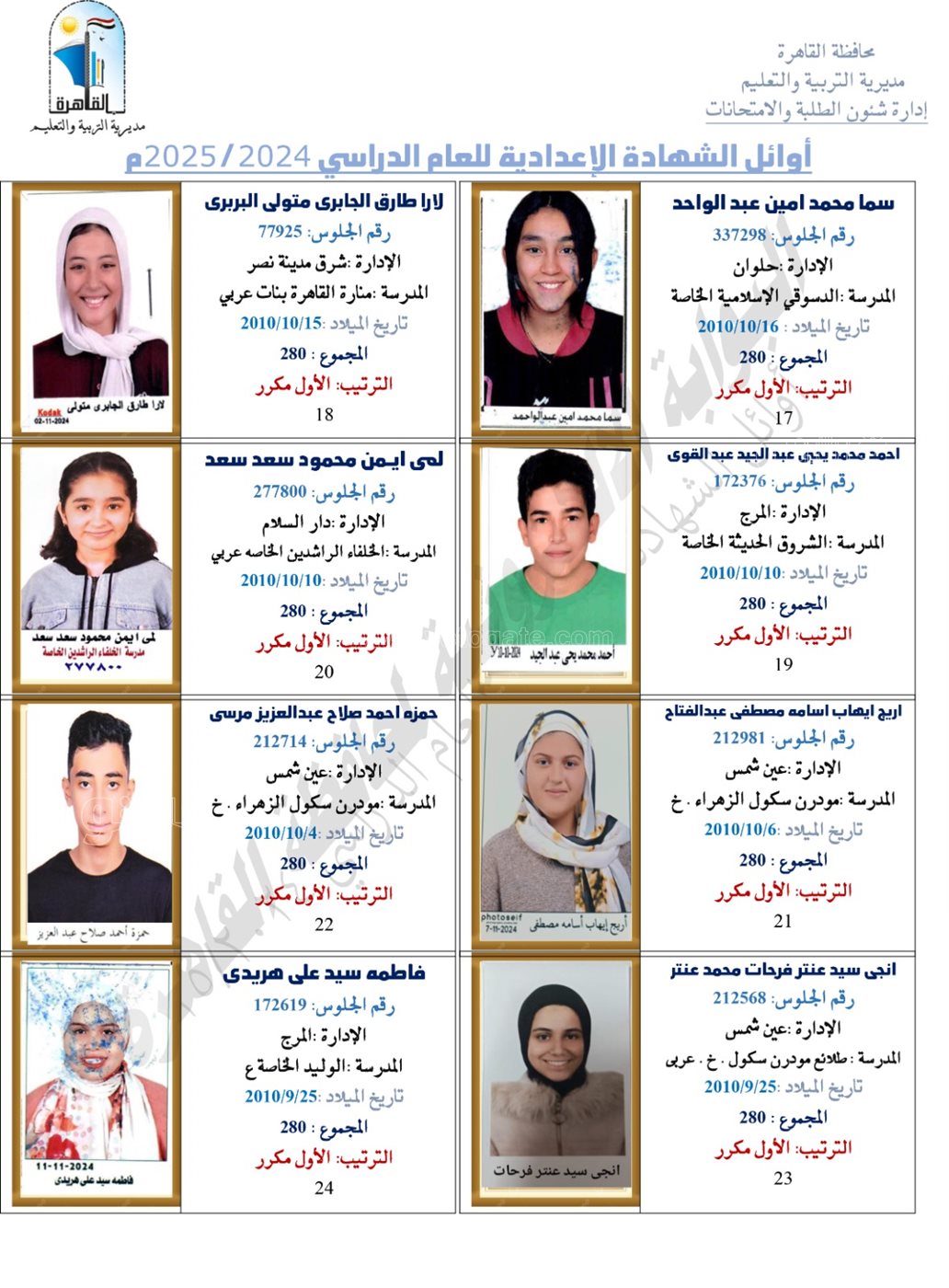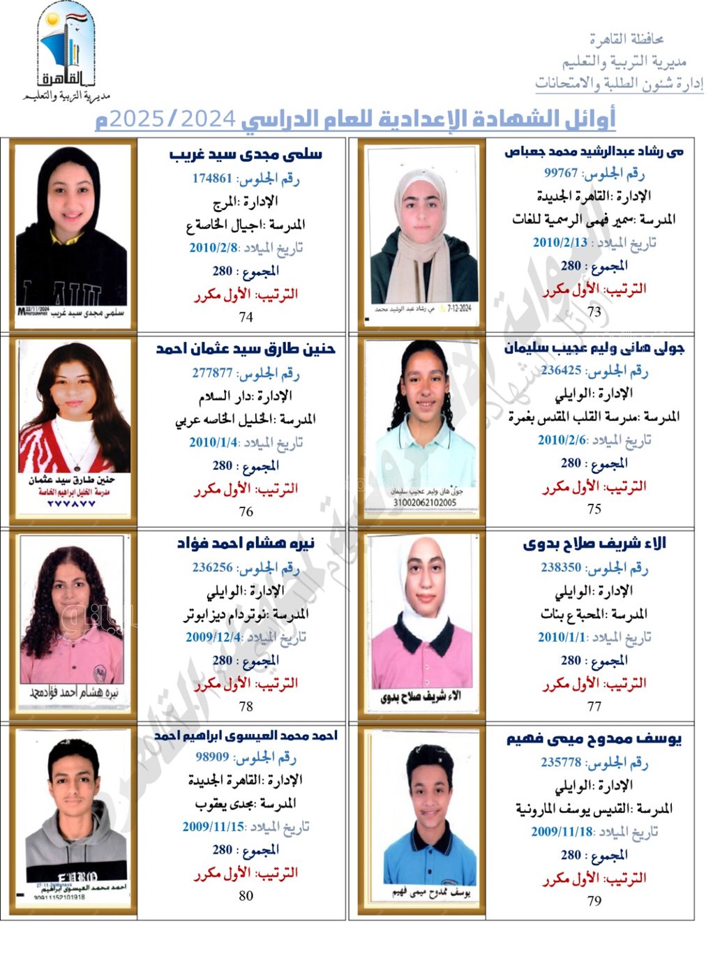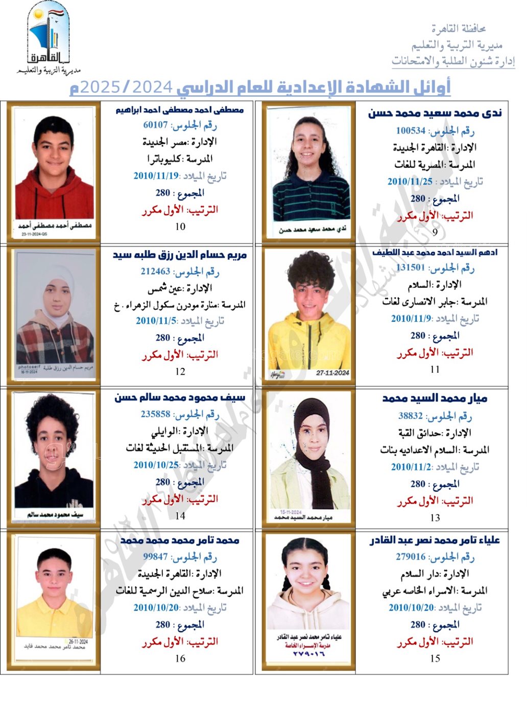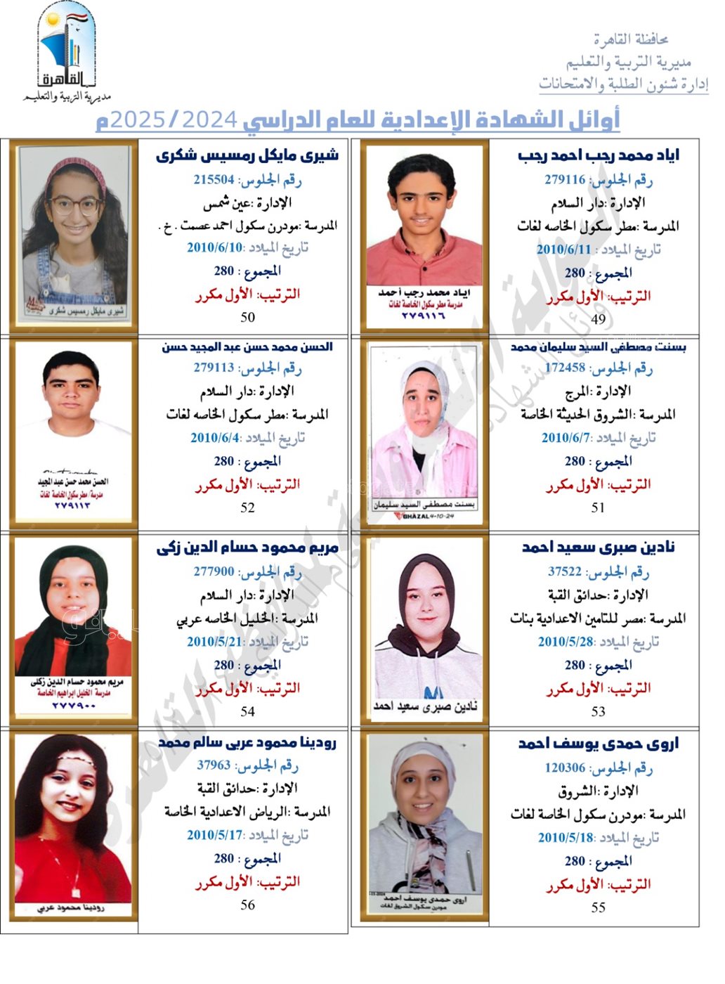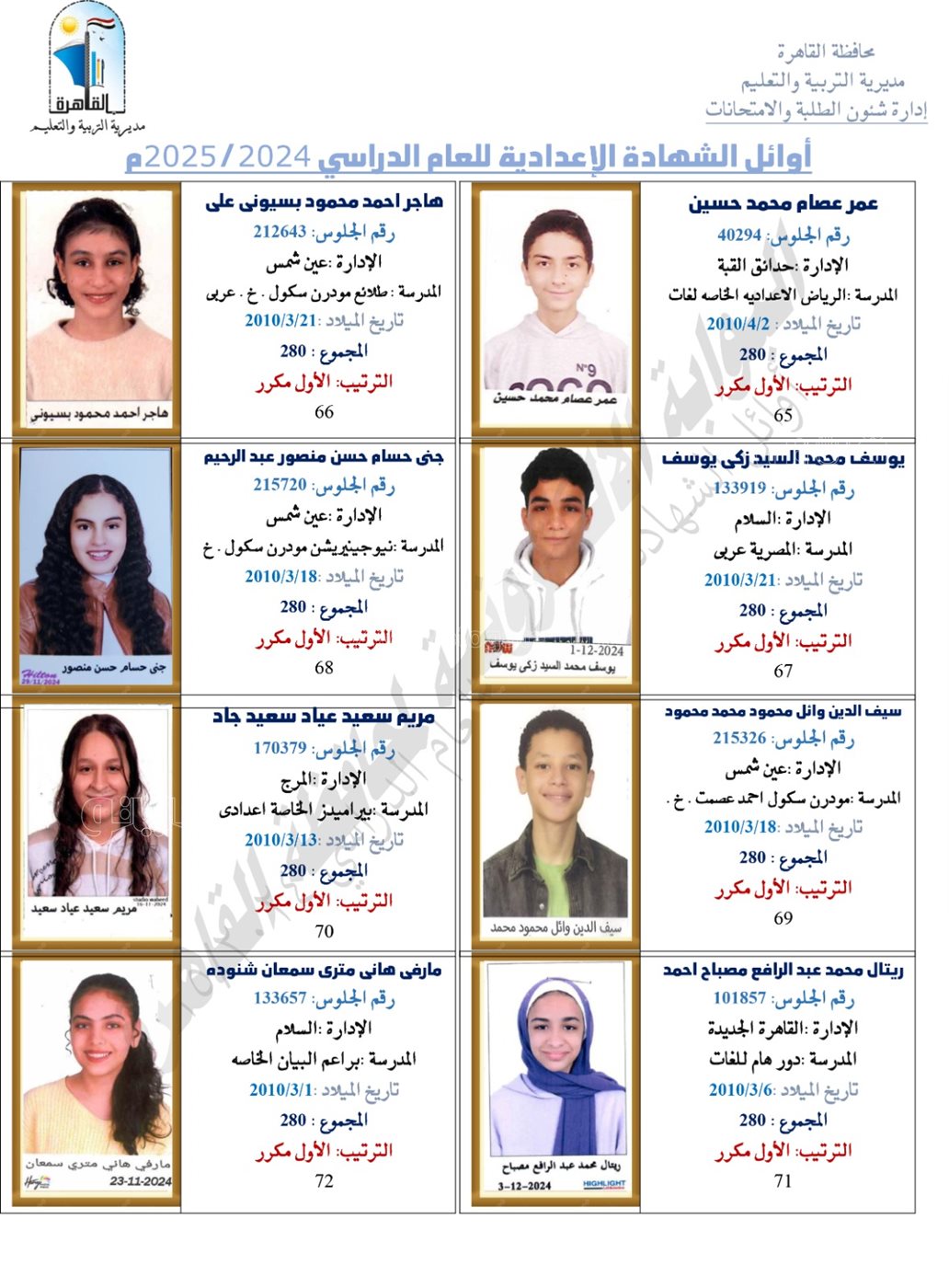 نتيجة الشهادة الإعدادية محافظة القاهرة بالاسم، أعلنت مديرية التربية والتعليم بالقاهرة، قائمة أوائل الشهادة الإعدادية 2025 بمحافظة القاهرة، بعد تعديلها من أخطاء وضع أسماء فتيات على صور بنين.
