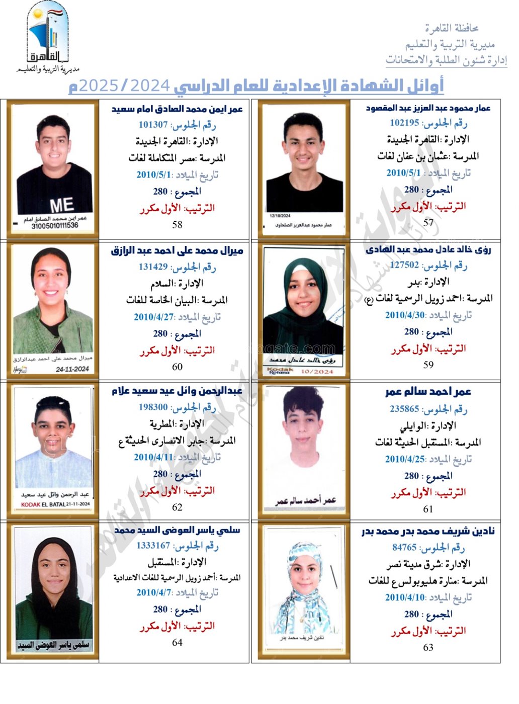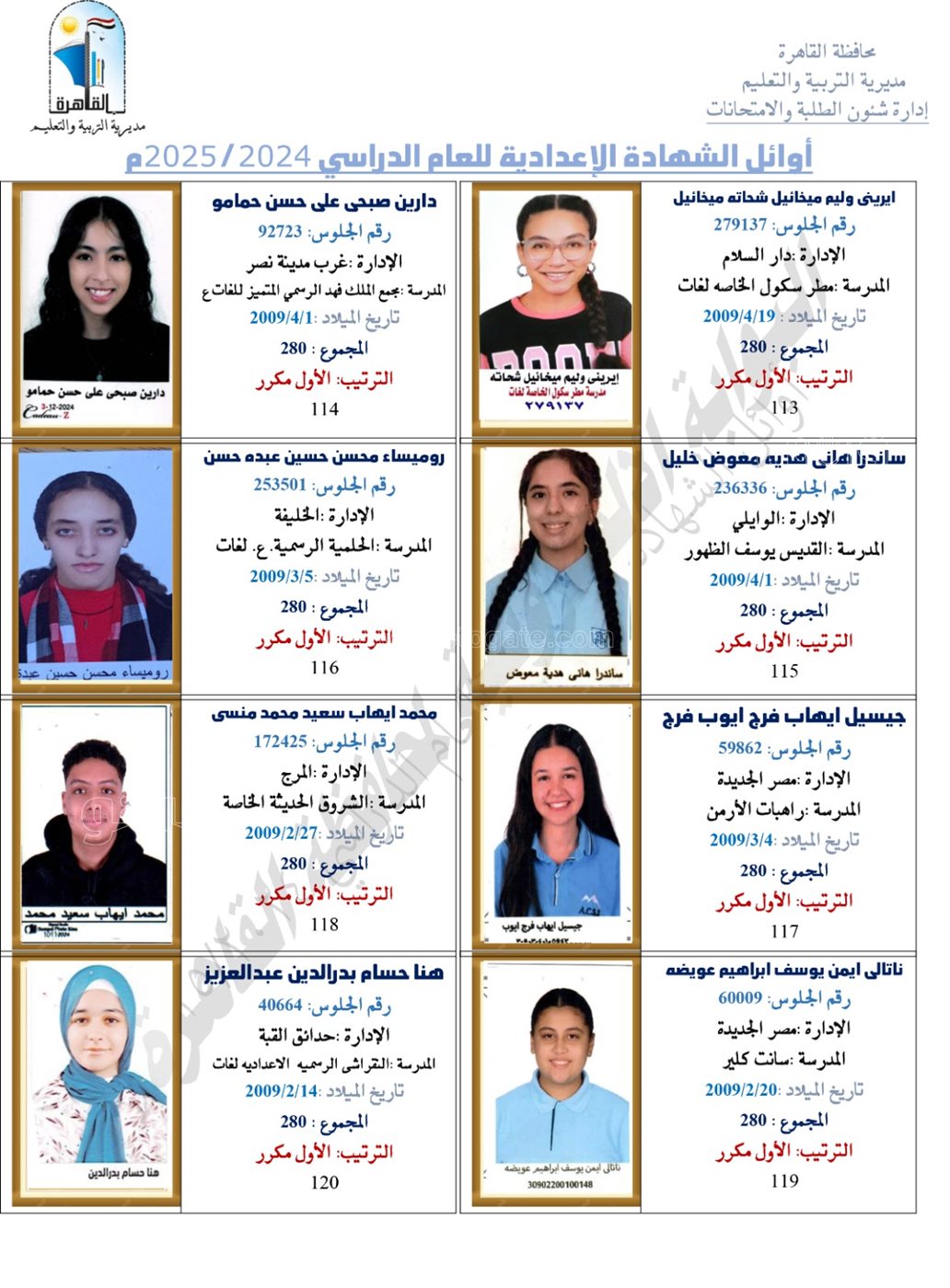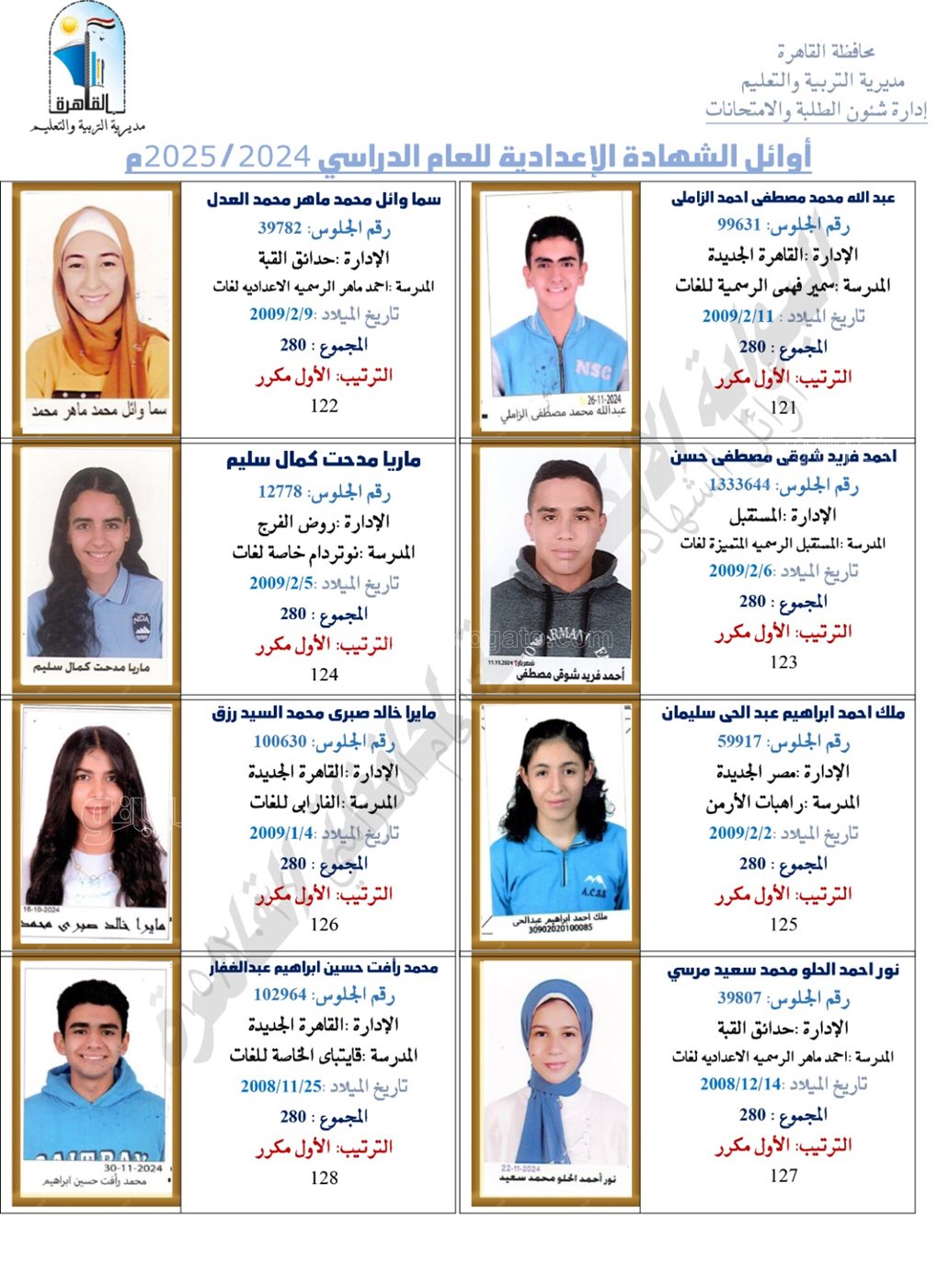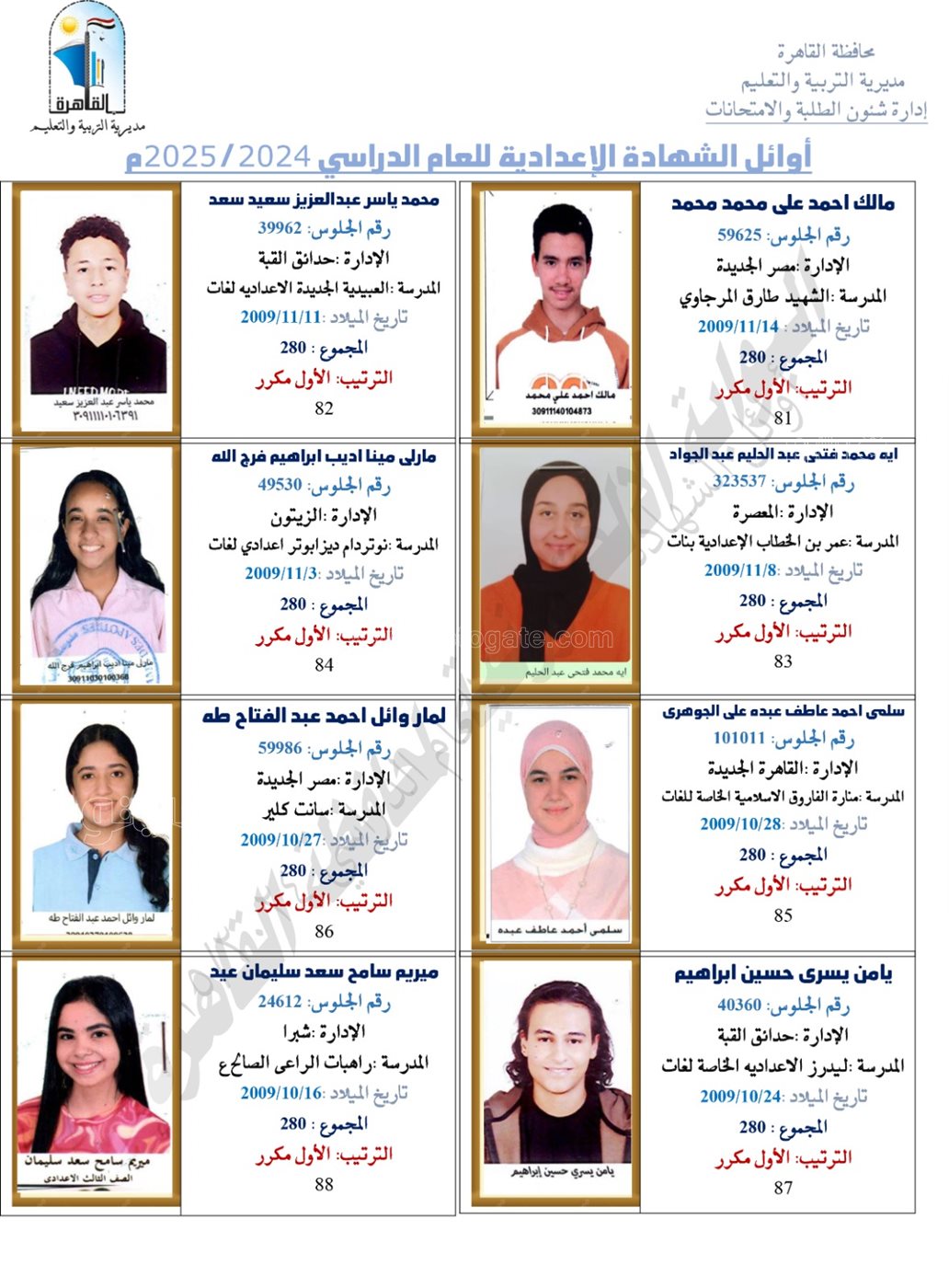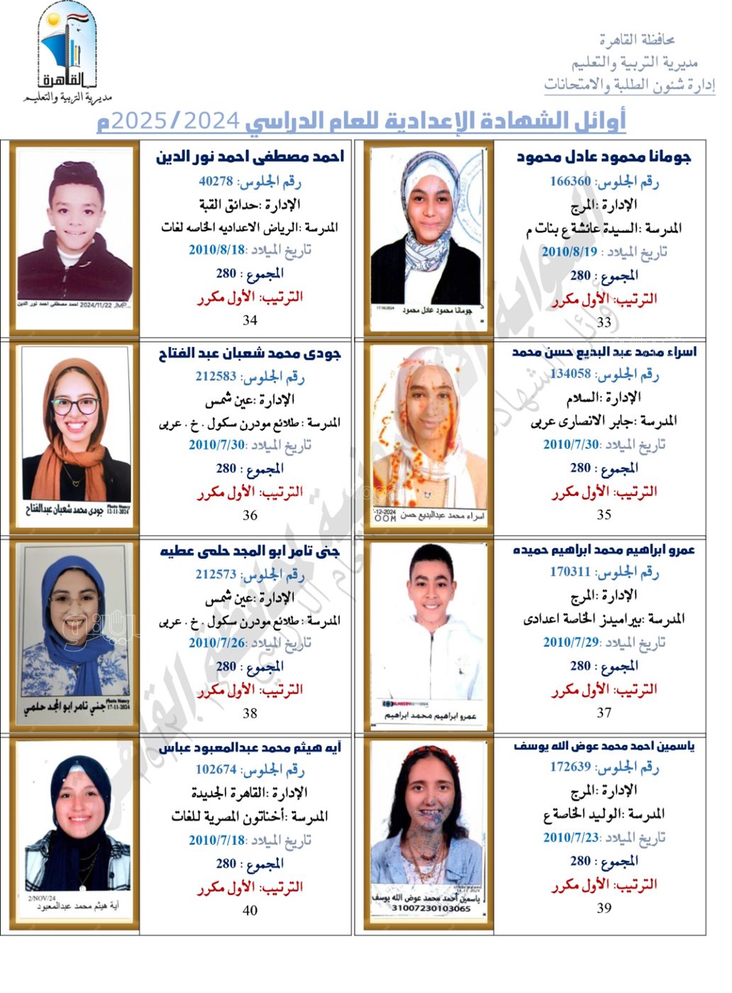 نتيجة الشهادة الإعدادية محافظة القاهرة بالاسم، أعلنت مديرية التربية والتعليم بالقاهرة، قائمة أوائل الشهادة الإعدادية 2025 بمحافظة القاهرة، بعد تعديلها من أخطاء وضع أسماء فتيات على صور بنين.