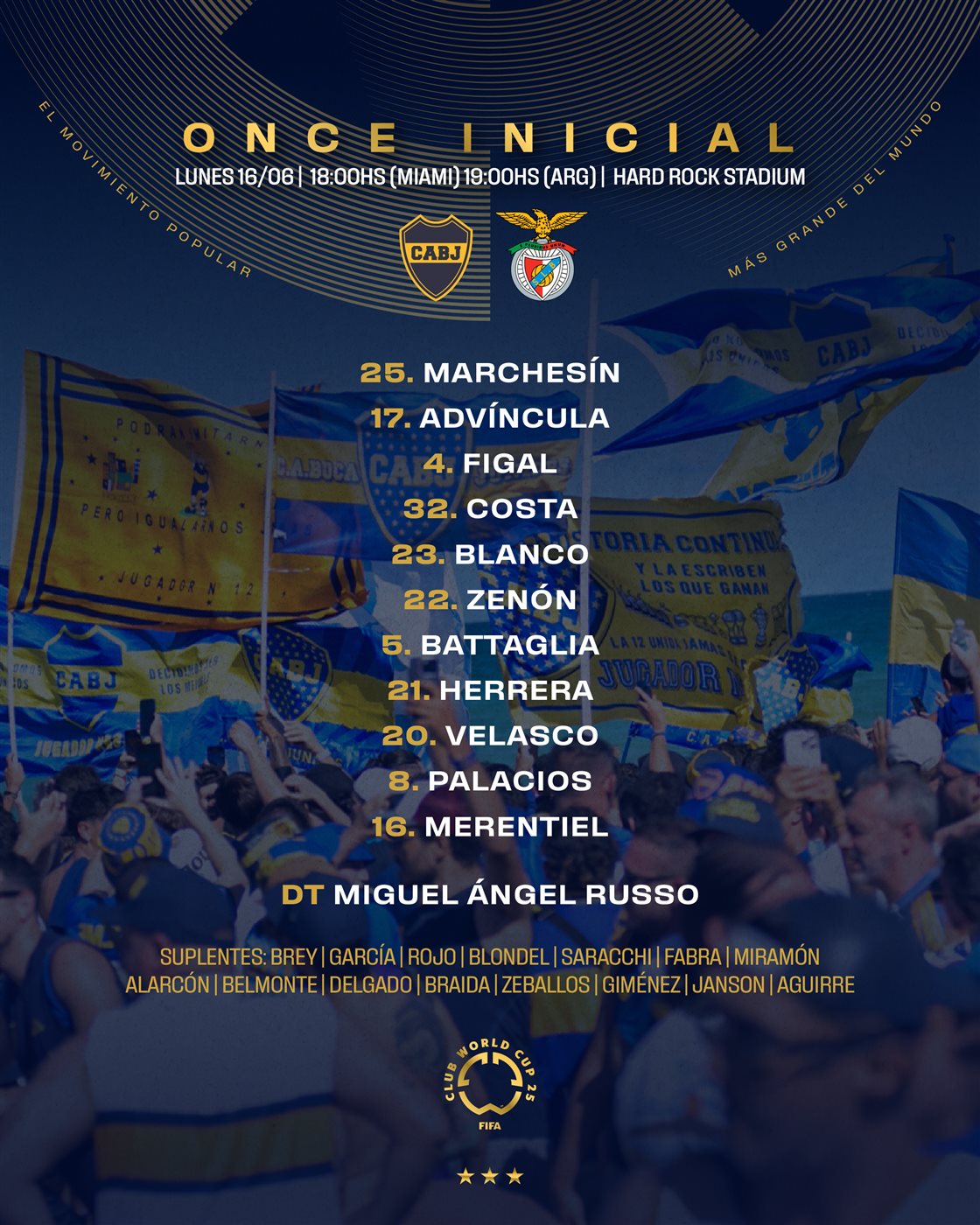 أعلن ميجيل أنخيل روسو مدرب فريق بوكا جونيورز الأرجنتيني تشكيله الرسمي الذي سيخوض المواجهة المرتقبة أمام نظيره بنفيكا البرتغالي، بعد قليل، ضمن منافسات الجولة الأولى من دور المجموعات في بطولة كأس العالم للأندية.