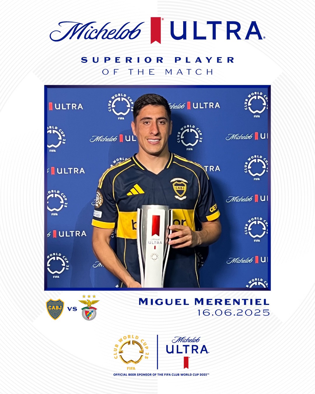 حصد ميجيل ميرينتيل مهاجم بوكا جونيورز الأرجنتيني علي جائزة رجل مباراة فريقه أمام بنفيكا في الجولة الأولى للمجموعة الثالثة لبطولة كأس العالم للأندية 2025.