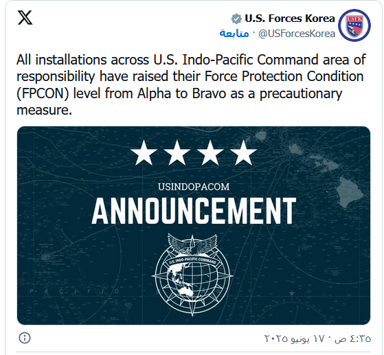 رفعت المنشآت الواقعة ضمن نطاق مسؤولية قيادة منطقة المحيطين الهندي والهادئ التابعة للولايات المتحدة مستوى حالة حماية القوة، وذلك كإجراء احترازي في ظل التصعيد بين إيران وإسرائيل.