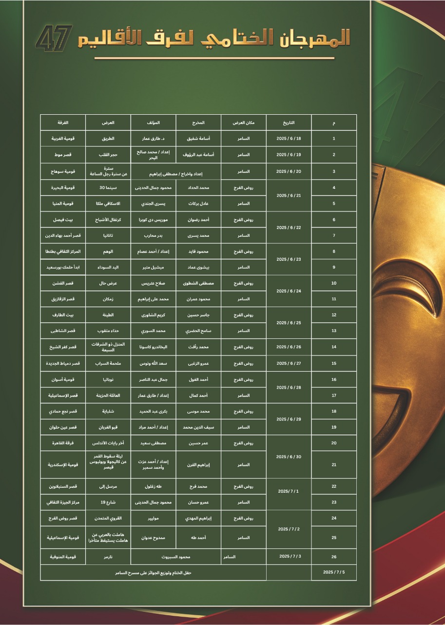 26 عرضا مسرحيا بالدورة 47 من المهرجان الختامي للفرق المسرحية