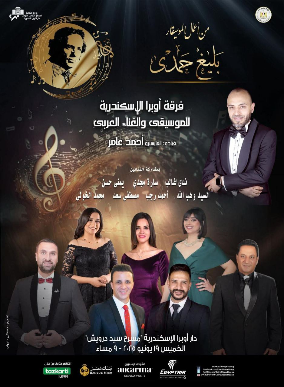 تنظم دار الأوبرا المصرية برئاسة الدكتور علاء عبد السلام حفلًا لفرقة أوبرا الإسكندرية للموسيقى والغناء العربى بقيادة المايسترو أحمد عامر في التاسعة مساء الخميس ١٩ يونيو الجاري على مسرح سيد درويش “ أوبرا الإسكندرية “، والتي تأتى بعنوان ” من أعمال الموسيقار بليغ حمدي".