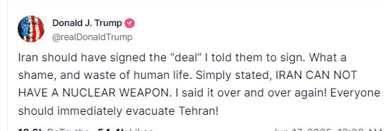 وأضاف ترامب: "ببساطة، لا يمكن لإيران امتلاك سلاح نووي. لقد كررتُ ذلك مرارًا وتكرارًا! على الجميع إخلاء طهران فورًا".